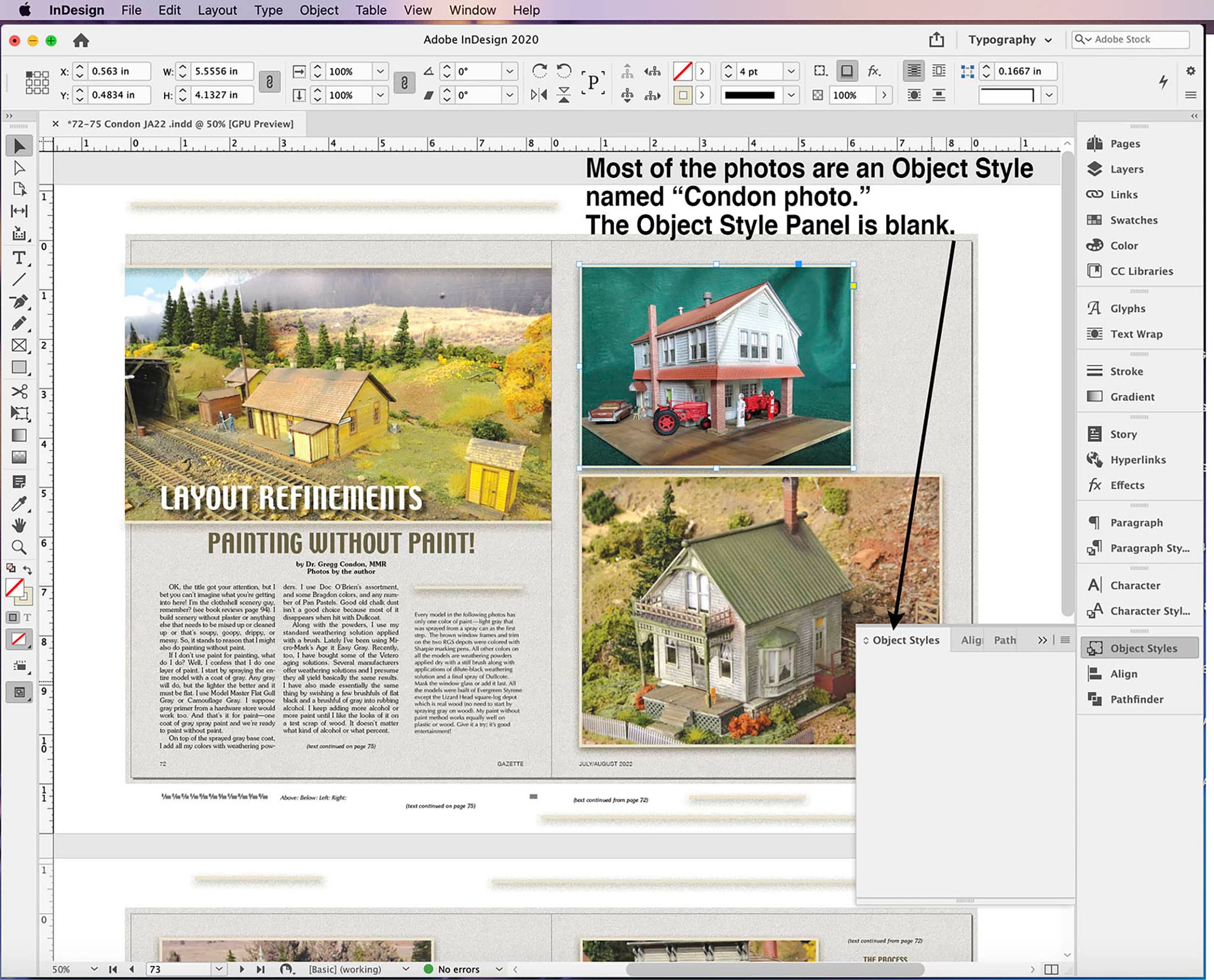 I submitted 3 Screen Shots in JPEG format so it can be viewed in detail, of an InDesign document that has a number of placed photos and an Object Style on the photos. As you can see, those panels are blank.