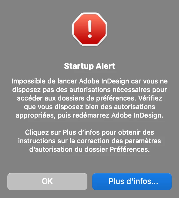 "Impossible de lancer Adobe InDesign car vous ne disposez pas des autorisations nécessaires pour accéder aux dossiers de préférences. Vérifiez que vous disposez bien des autorisations appropriées, puis redémarrez Adobe InDesign.