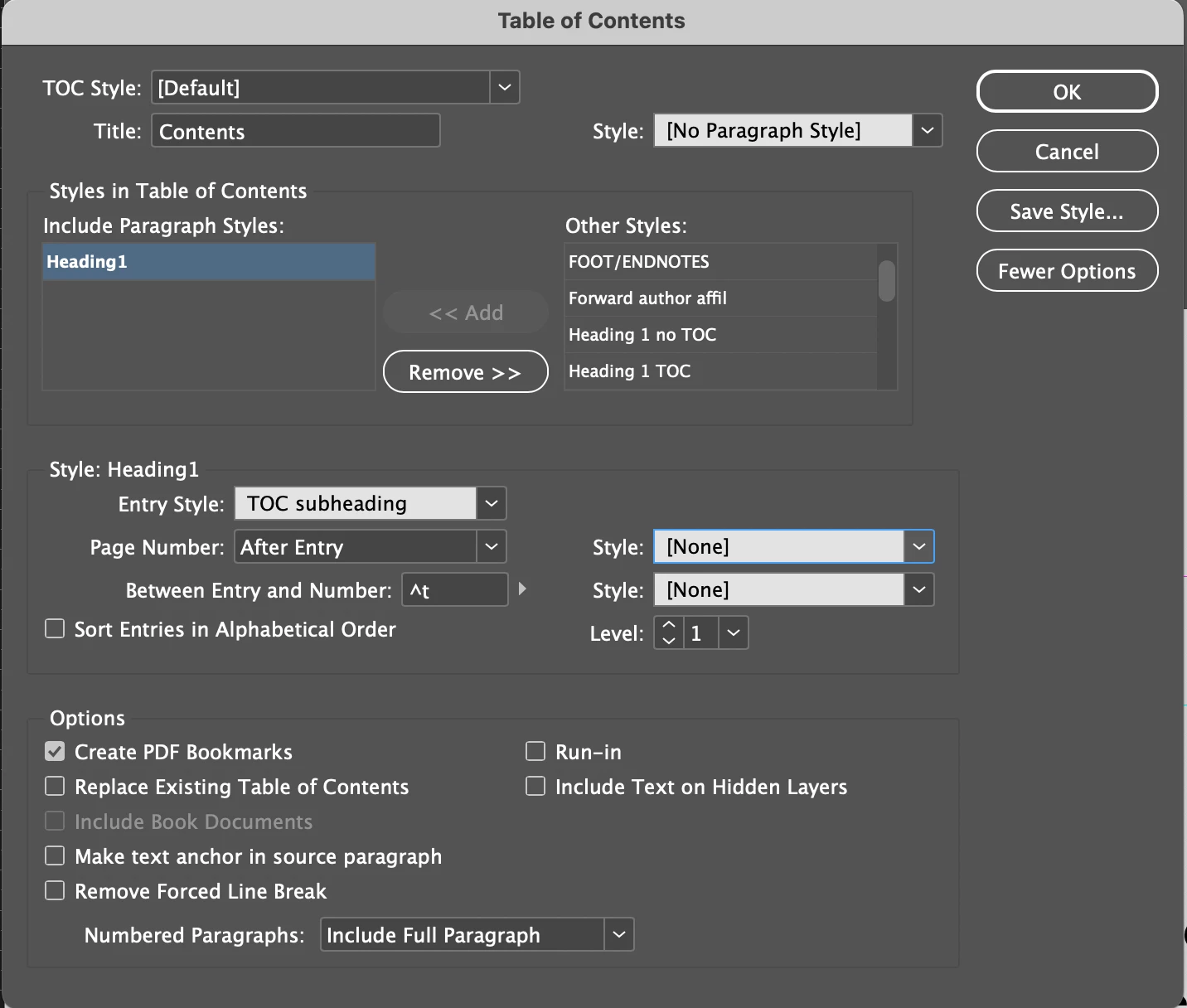 InDesign not pulling Heading1 style for table of contents for threaded text frames