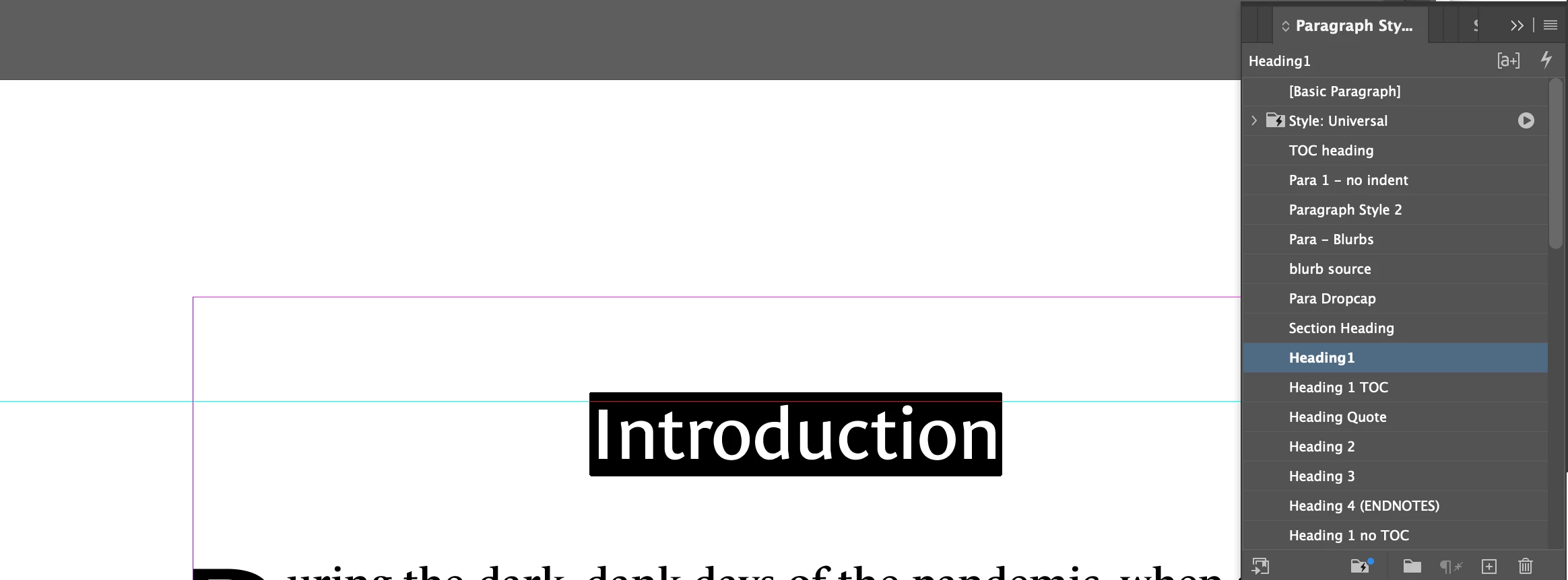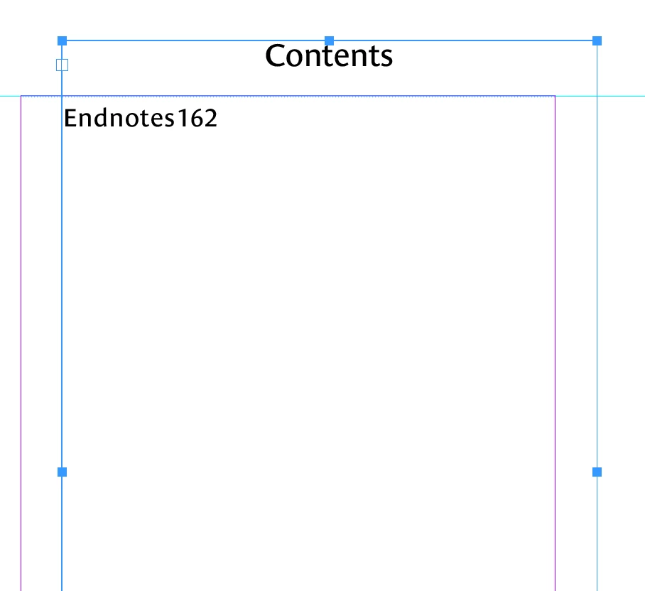 For some reason, the only heading getting pulled is the Endnotes, which automatically generated a new text box. It has the exact same paragraph style applied. I tried a few other things other peope tried to fix their TOC, including saving the file as an IDML, and deleting the extra text boxes I had to separate out the Chapter Headings, but still no joy. If I make a new (unthreaded) text box and apply Heading1 style to the text, THOSE show up in the TOC. I really don't want to have to make a TOC manually, and add jump links manually, because chances are my client will have edits and I'll have to redo it again. Any leads would be most appreciated!