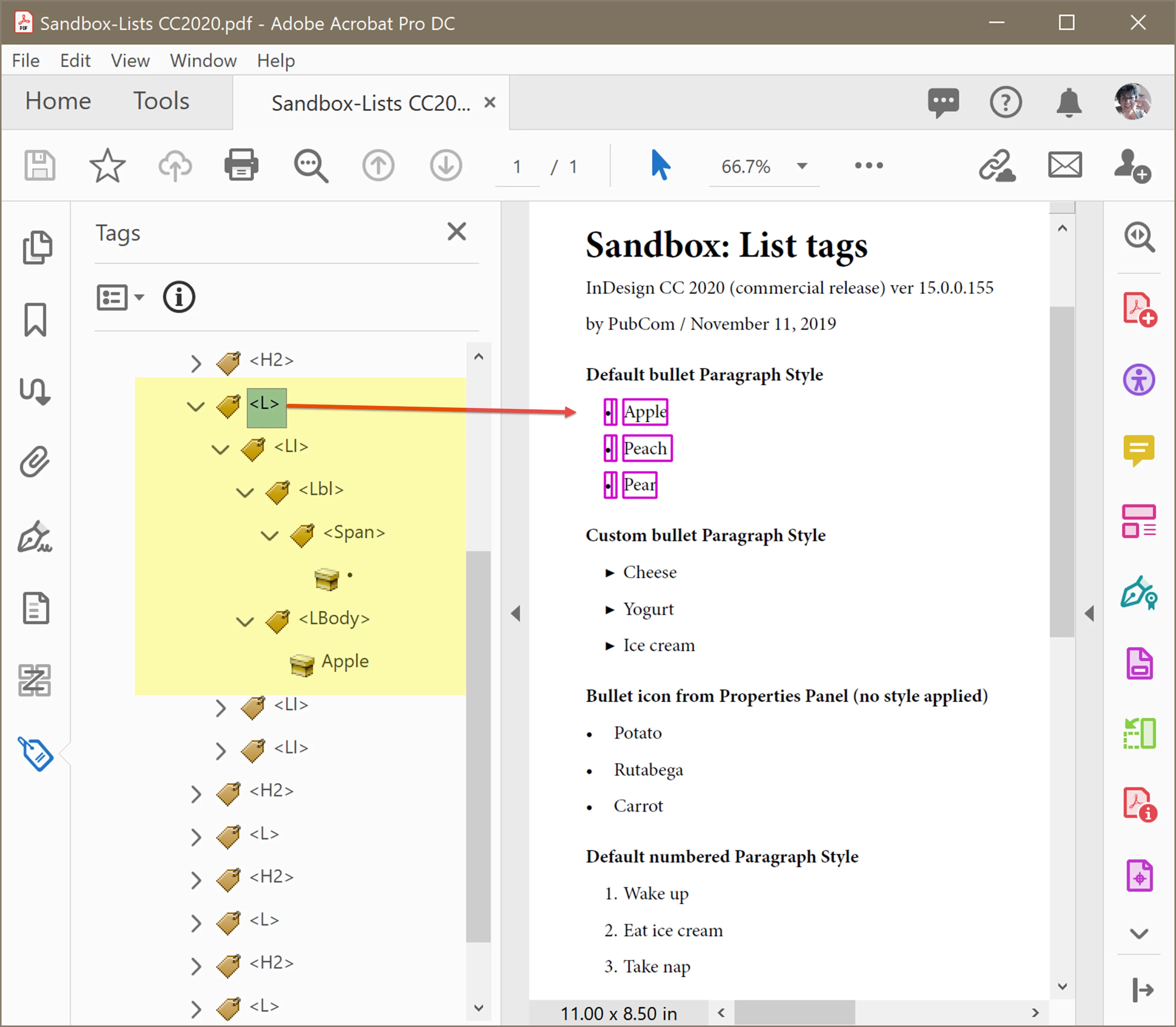 In previous builds, if a bullet or numbered list was used, it was automatically tagged with the <L> combo of tags. But with the release of 2020, if the user sets another tag in the Export Tagging dialogue box, it overrides the <L> combo.