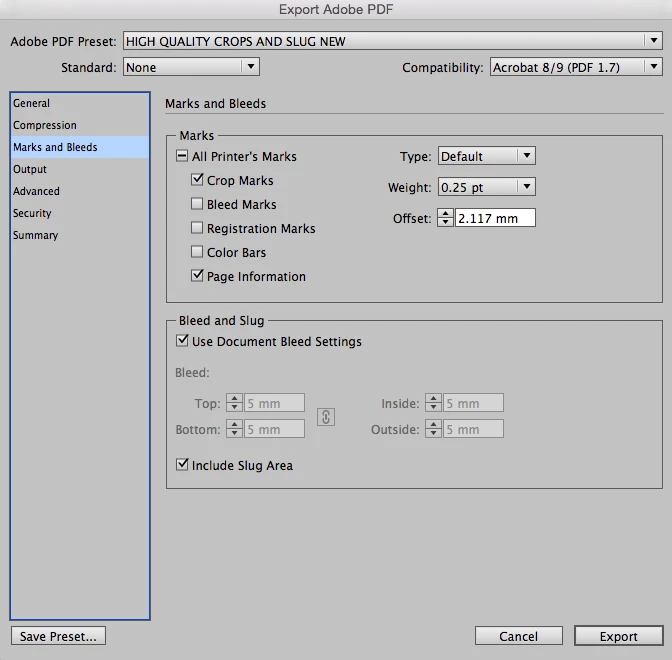Now that the design is confirmed, I was going to export it single page with bleeding marks and color bar.