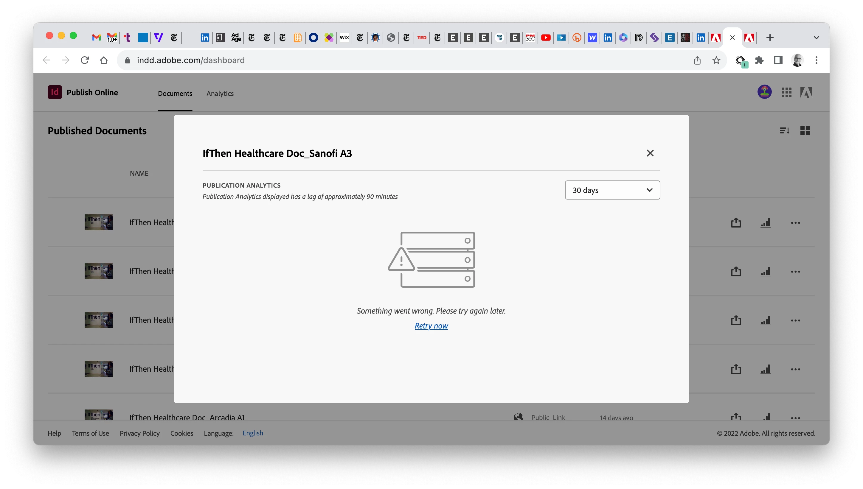 I am unable to access the Publication Analytics page within the Indesign Publish Online Dashboard. All I see are circling blue squares. Can someone suggest a solution to this problem? Thanks.