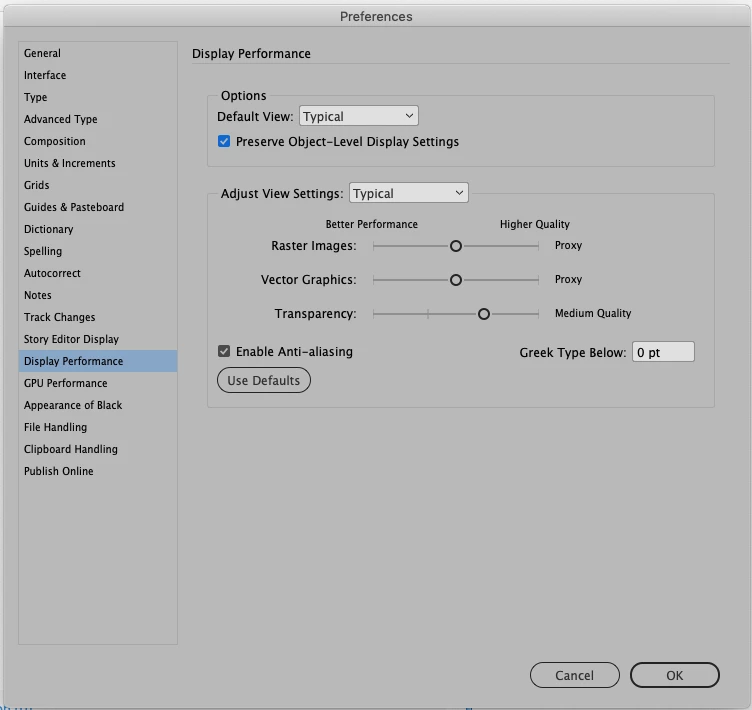 application (file?) or the object is set to Display Performance > Typical,