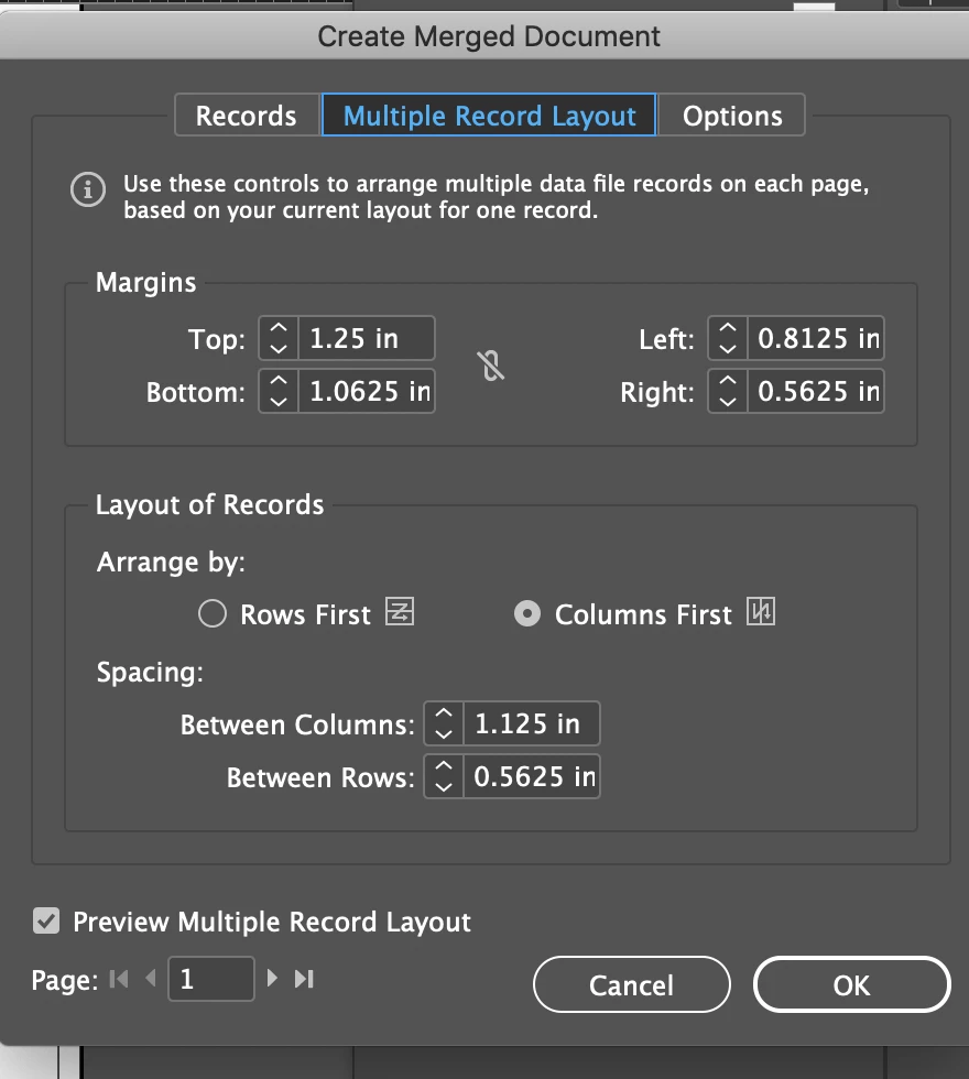 When I do the actual data merge, it goes fine for the first 6 or so records and then InDesign starts repeating the same last record over and over until the end of the document (ie 250 or so times).