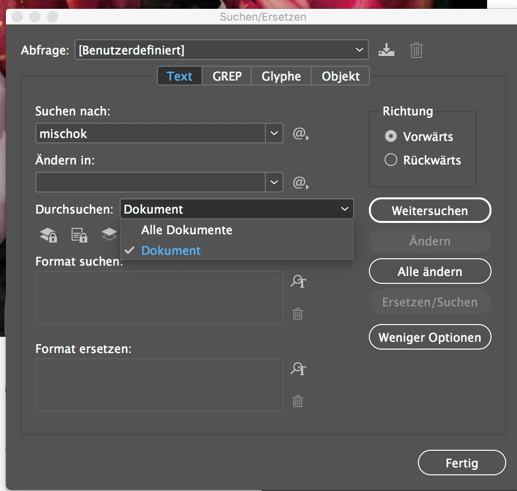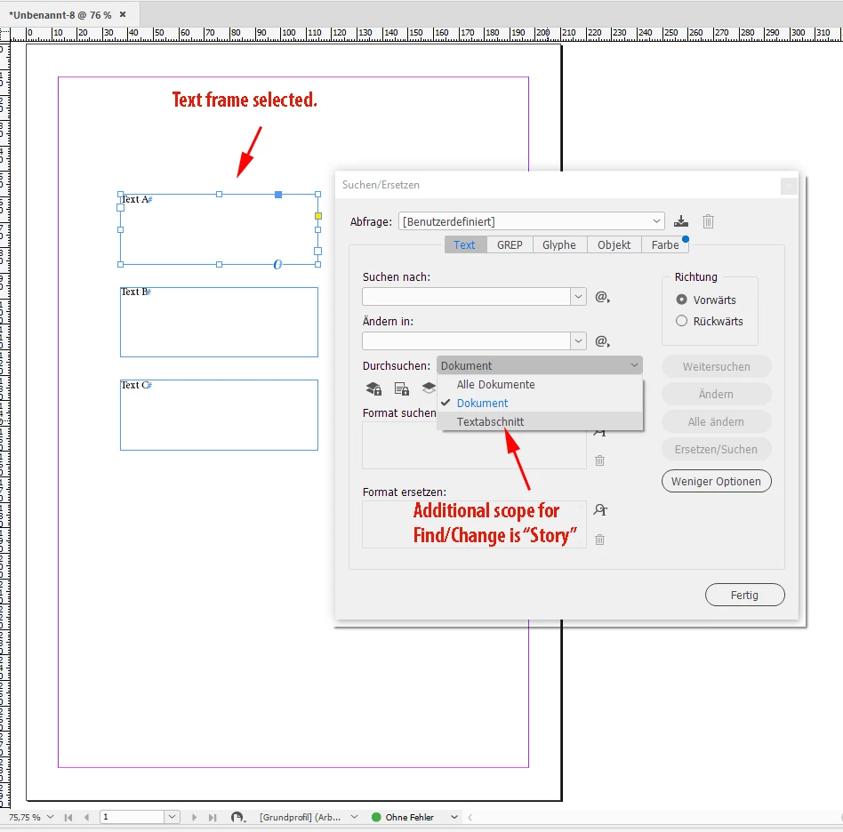 InDesign’s search function is not working properly for years and years … and I’m with it since version one (wich was not suitable for working with). So … I don’t now how the search scopes are named in English, just in German … I always can only search in »document« or »all documents« … but I often do need to search in »selection« (in German »Auswahl«) or in the »text block« (in German »Textabschnitt«) … the latter two options always disappear. Why is that so? And why is Adobe not interested in any bug reports? I fund so many bugs—they don’t fix ’em …