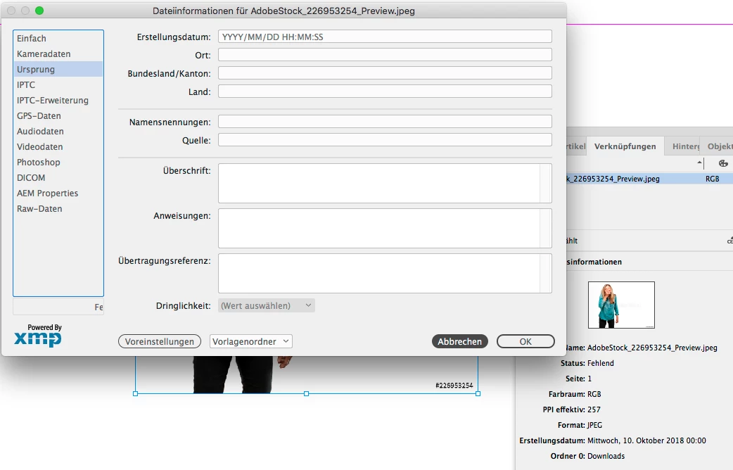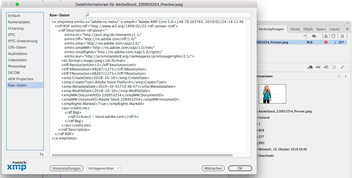 Example 2 – xmp-data for missing image taken from indd-file displayed with "less-command":
