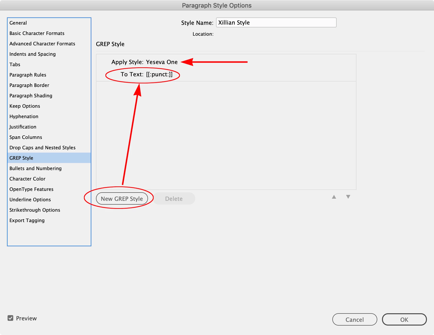 I'm using a custom font for my headers in InDesign called Xillian Family, which doesn't have any punctuation marks. If I need to use punctuation within a header, I apply a font called Yeseva One. I'm trying to automate this process by writing an indesign script that will automatically apply a Yeseva One character style to any punctuation within a text range or text frame that uses Xillian Family. I tried using the script below, but it's not working.