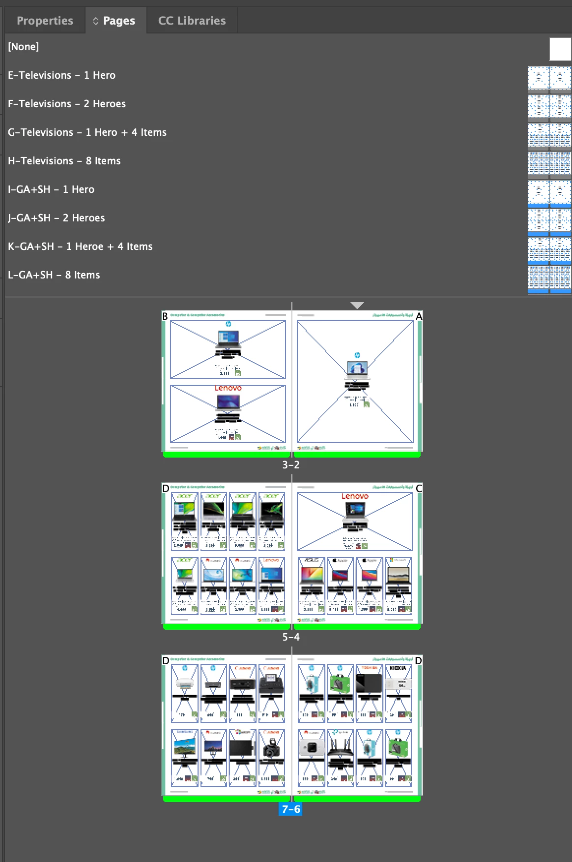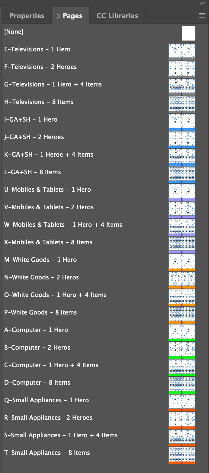 I'm working on a template layout for a product-flyer that has multiple parent pages (5 categories with 4 page layouts for each category (ex. 1 Hero product, 2 Hero products, 1 hero + 4 normal products, 8 normal products).