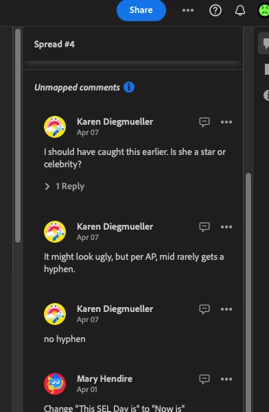 I’ve seen this problem mentioned in the InDesign Community a few times in the past, but has anyone recently had problems with Share for Review comments unmapping from their pins?