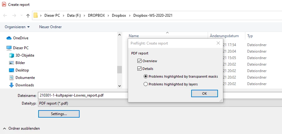 Dialog sample from Acrobat Pro where you have the option to create a preflight report as text file or a commented PDF with various options: