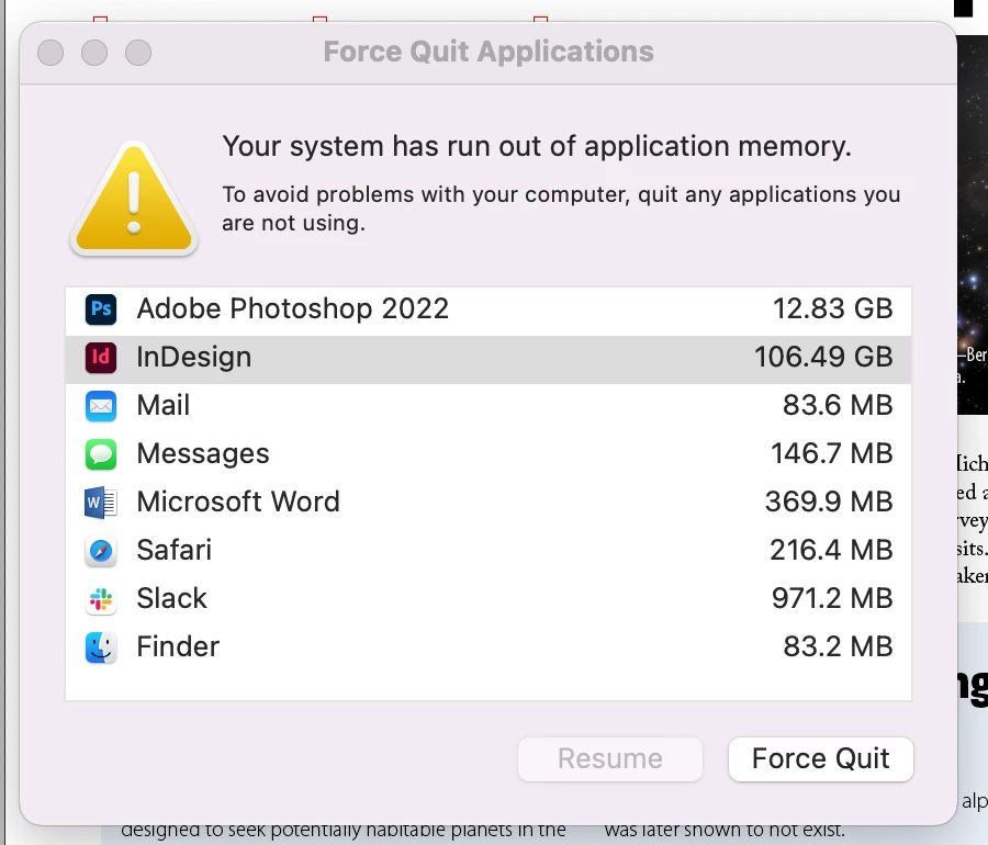 indesign steals all memory and then shuts down