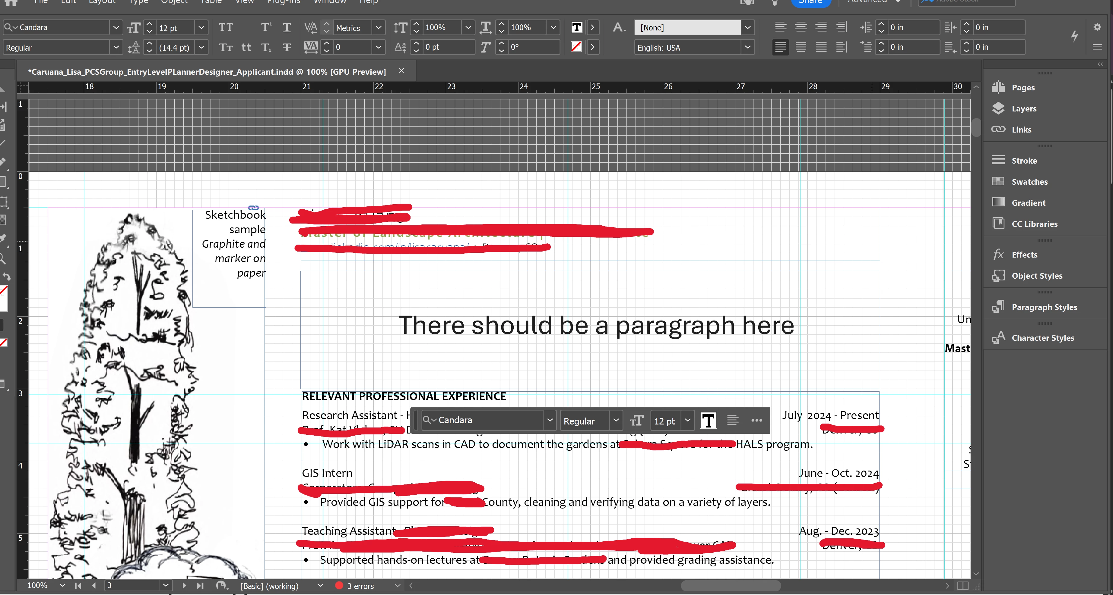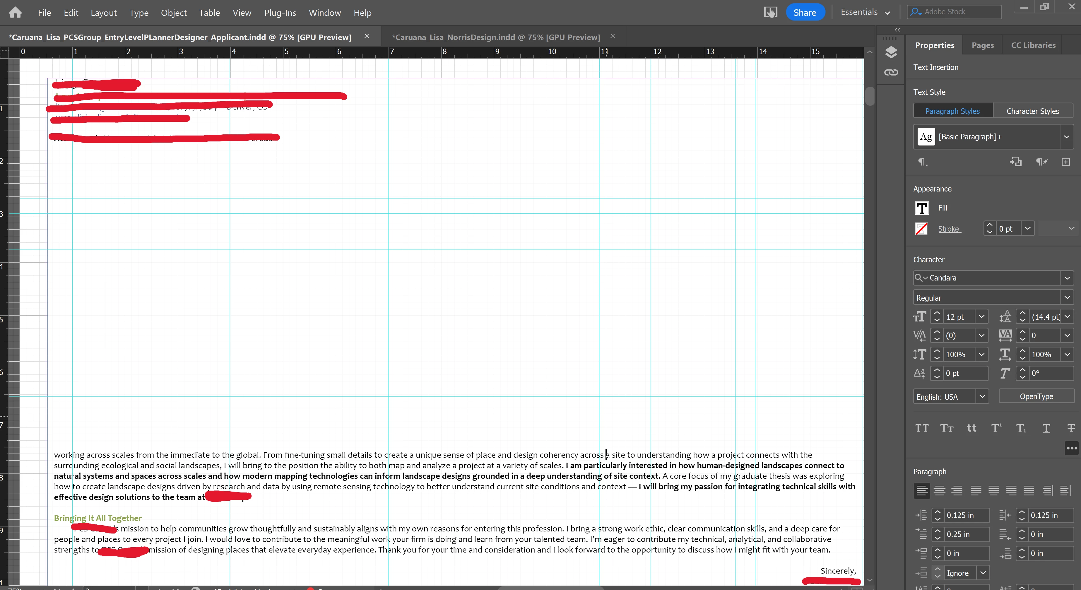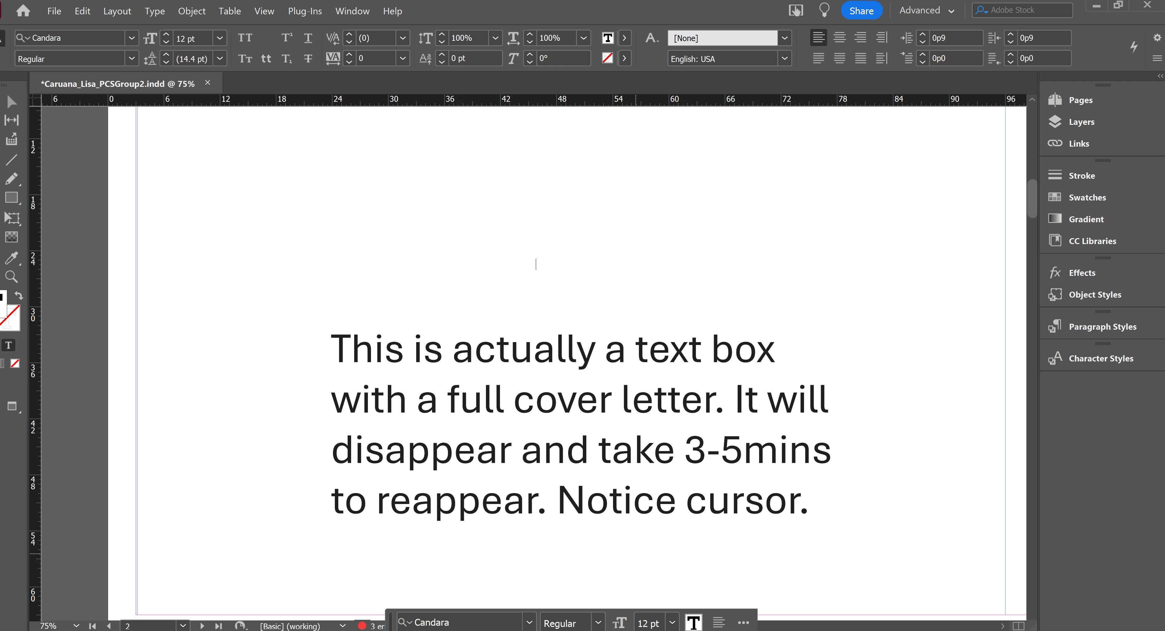 I have a 39pg. InDesign document that I have been working in for the past year (professional portfolio, so I have saved a copy multiple times. Mainly consists of graphic images and GIS maps, the issue is with the text boxes) and the text keeps disappearing and freezing in whatever text box I am working in. I recently graduated and switched from my school account to a private subscription, and that is when the problem started. The text will disappear from the text box for upwards to 3-5 minutes and only reappear when I start just scrolling up and down in the document, and then it reappears in strips and chunks. The cursor will flash in the blank text box and I can type on my keyboard and changes will be there when the text reappears, but I can't see what I'm doing. This is happening multiple times a minute - almost every time I add a word or make a change - except of course when I shared my screen with support. I have talked with 3 different agents and none of them were able to solve the problem. I downloaded the text that I am using (Candara), have restarted my computer at least a dozen times, and am working in a brand new document saved directly to my desktop. One agent checked something connected to the GPU, saying that my preferences were set to not process graphics, but that did not solve the problem. Screenshots of instances when the text disappeared attached. Red markups are to protect personal information and not related to the issue. Any tips would be appreciated, as I have tried all of the troubleshooting recommended by the Adobe AI chatbot and various Google searches and the text box still keeps freezing and disappearing, making it almost impossible to work in the document. I really, really do NOT want to change the font style, as I feel like Candara is common enough it should work and that will also create a lot more work for me in terms of making sure the whole 39pg document converts correctly, so hoping to avoid that. TIA!