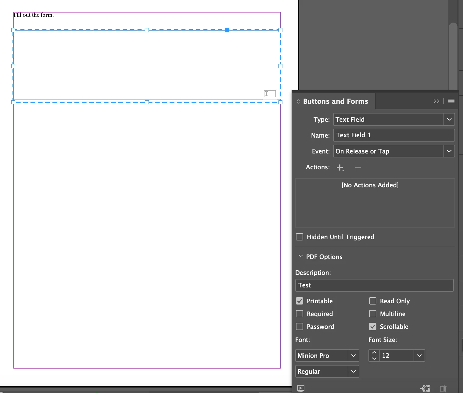 So I create a rectangle, use Object > Create Text Field, then set options in the Buttons and Forms panel. I export to PDF using Interactive PDF settings, with Interactive Elements set to Include Appearance. When I open the PDF (in Acrobat Pro OR Reader), it doesn't recognize the text field at all.