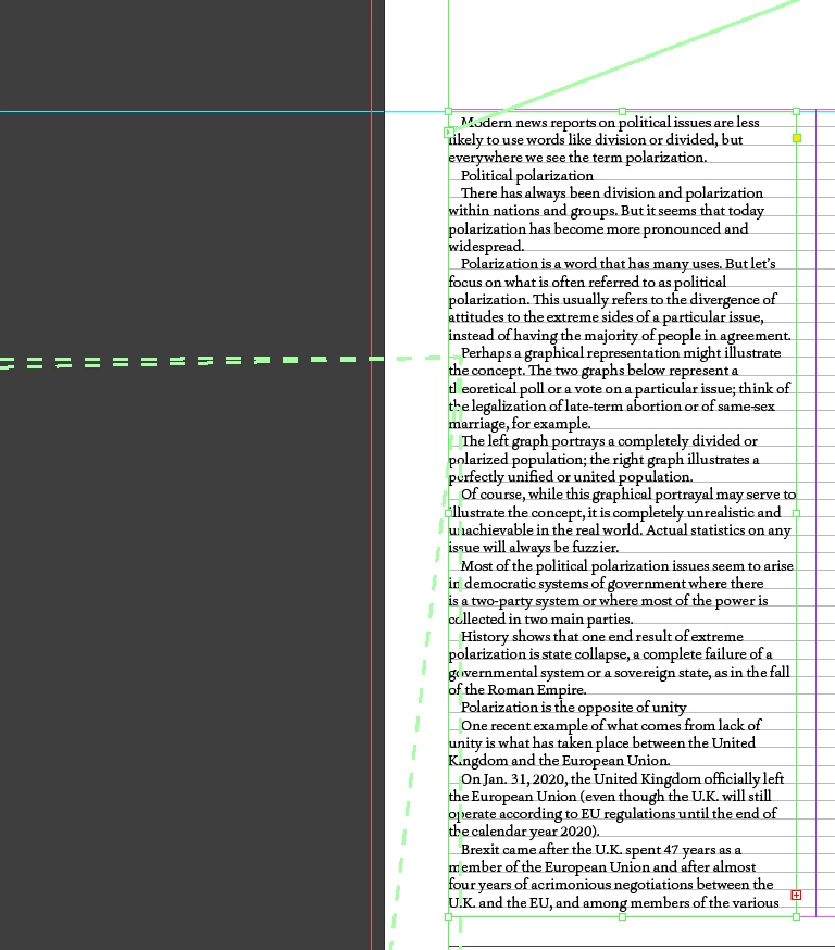 Text is uneditable and text block has these odd dashed green lines extending off into infinity (see below). I'm not talking about the linked text block solid line. What is causing this problem? I updated InDesin after I began having this issue and that did not solve my problem. I'm operating on a Mac.  Thanks for any advise!