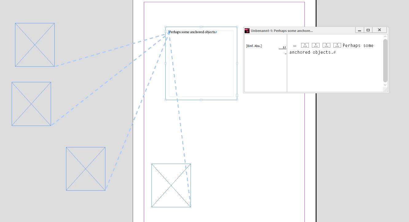 From my German InDesign 2020 where I created some text with four anchored objects before the word "Perhaps". Story Editor is open as well: