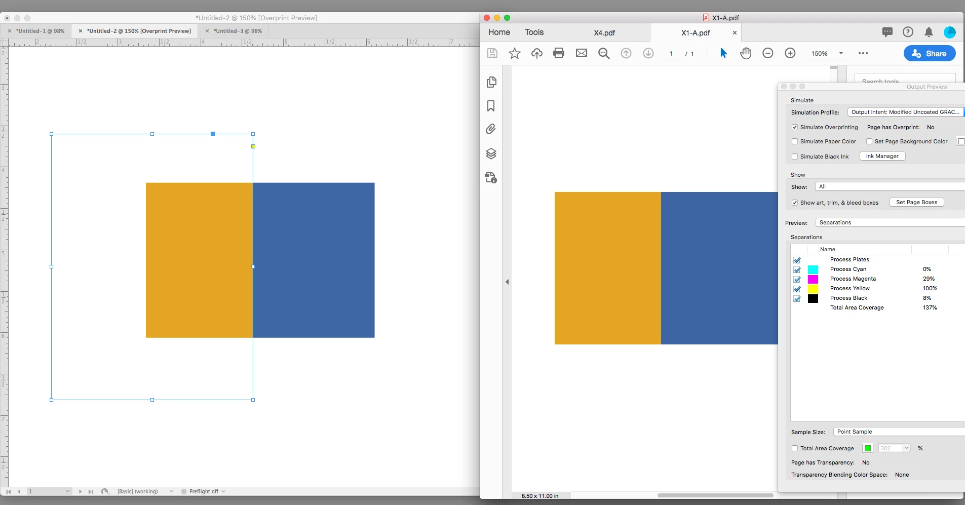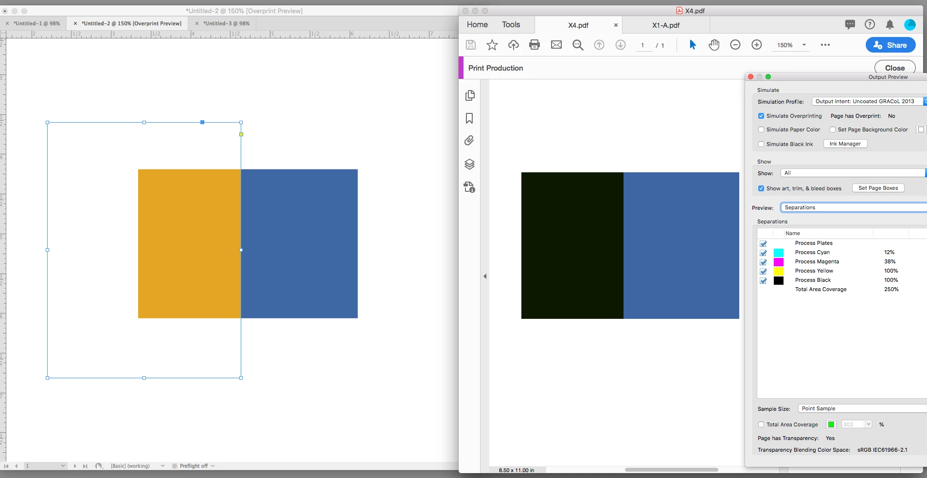 Second a I have a box with a solid black fill overlaying a photo on a separate layer. The box blend mode is set to Difference so you have part of the background texture showing through. However when I output this file as a PDF the box is sold black. Again have tried flattening the file in Acrobat Pro. Have also tried changing the box fill to solid yellow and solid cyan, still outputs as solid black although on screen you see the base layer texture show through. This issue also affects PDF/4:2008 files. When I export as a FOGRA39 CMYK JPEG the box looks as it should with texture show through.