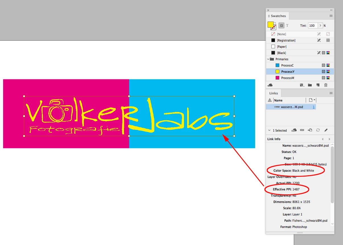 Ich möchte das korrigieren, um zu vermeiden, dass nach dem Druck möglicherweise kleine weiße Ränder um das Logo herum stehenbleiben, da keine Druckerei der Welt alle Druckfarben registergenau drucken kann. Dazu setze ich die Füllung des Logos innerhalb seines Grafikrahmens auf "Überdrucken".