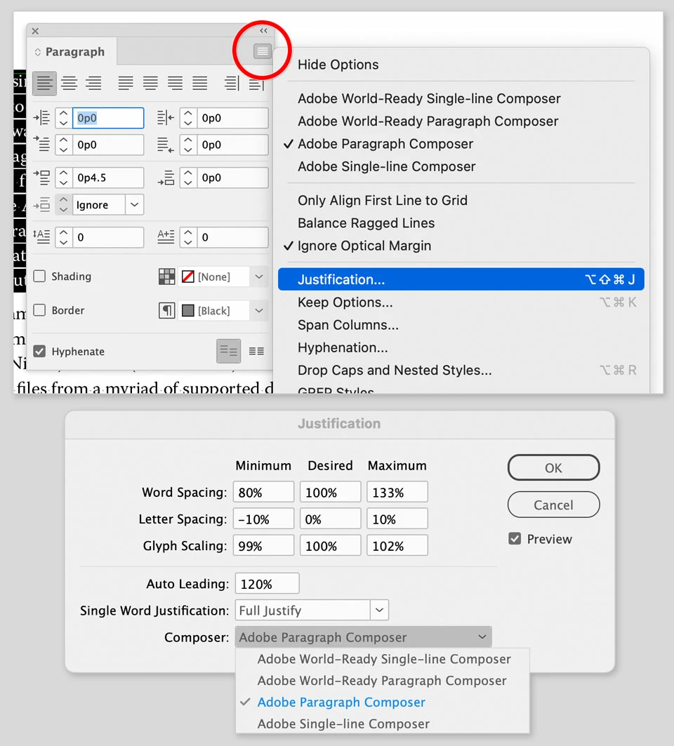 If all of that seems fine but the justfication still doesn’t look good when you flow it onto pages in InDesign, then you can start inspecting justification and composition settings in InDesign, as shown in the picture below. In the Paragraph panel, if you applied a justification option from the row of icons across the top, note that there are four different justification options among the nine icons for alignment and justification there — make sure the justification type that’s applied is the one you intended.