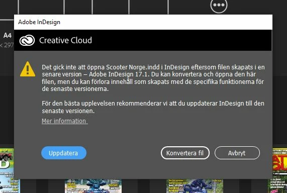 Updated my Indesign to version 17.4 recently. When I was going to open an older document that was made in version 17.1 I get an error that my Indesign is old and I need to update it to correspond to the Indesign document I want to open. Since Im running Indesign 17.4 it isnt any newer indesign version. So Im stuck in a loop where the document is version 17.1 and Indesign is 17.4 but the program says my Indesign software is to old and need an update to work with my document. Sorry the picture is in Swedish.