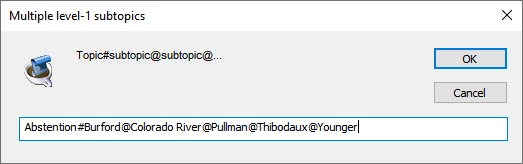 Abstention is easy; it has only five sub-topics, but I have a bunch of main topics that have 30 or more level-1 subtopics. I know that in the text I can enter a soft new line, but I don't know whether that will work in the index-entry pop-up box, and I've already put in enough work that I don't want to risk messing up what I've done.