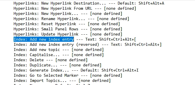I have figured it out (partialy). Changing entrie in in Show set was not useless, saving txt file for a new set was not succesfull (or I did not know how propery save it, of course at another set name and use it). At the end of all trials, I create a new set in menu Keyboard comand and just change the shortcut for the desired index. It works for the old file, the same idml file, old other files, but not for the new file.
