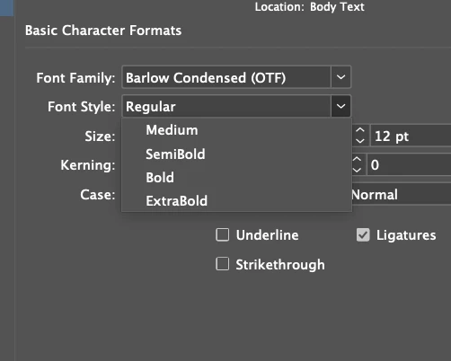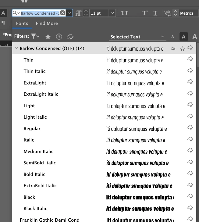 I have a font - Barlow (and Barlow Condensed) installed according to CC. I noticed that both INDD and AI recognize the font, but either do not display the entire font family or if it recognizes it, does not allow it to be used. In INDD specifically, I cannot use it to correct a style, but I can select it from the ribbon at the top and then “reset” the style. Similarly in AI, i see the font, but then when selected for my text, turns it blank.