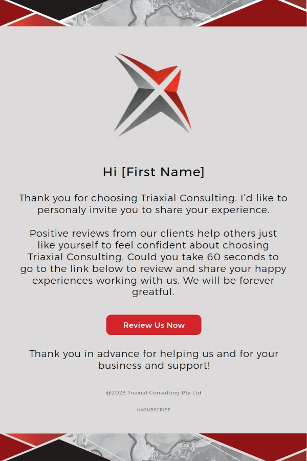 For example the button says "Review Us Now" the client is to click on this button and it takes them to our Google page. The other clickcable text is "Unsubscribe" and that opens up an email to send to us and we take them off our database.