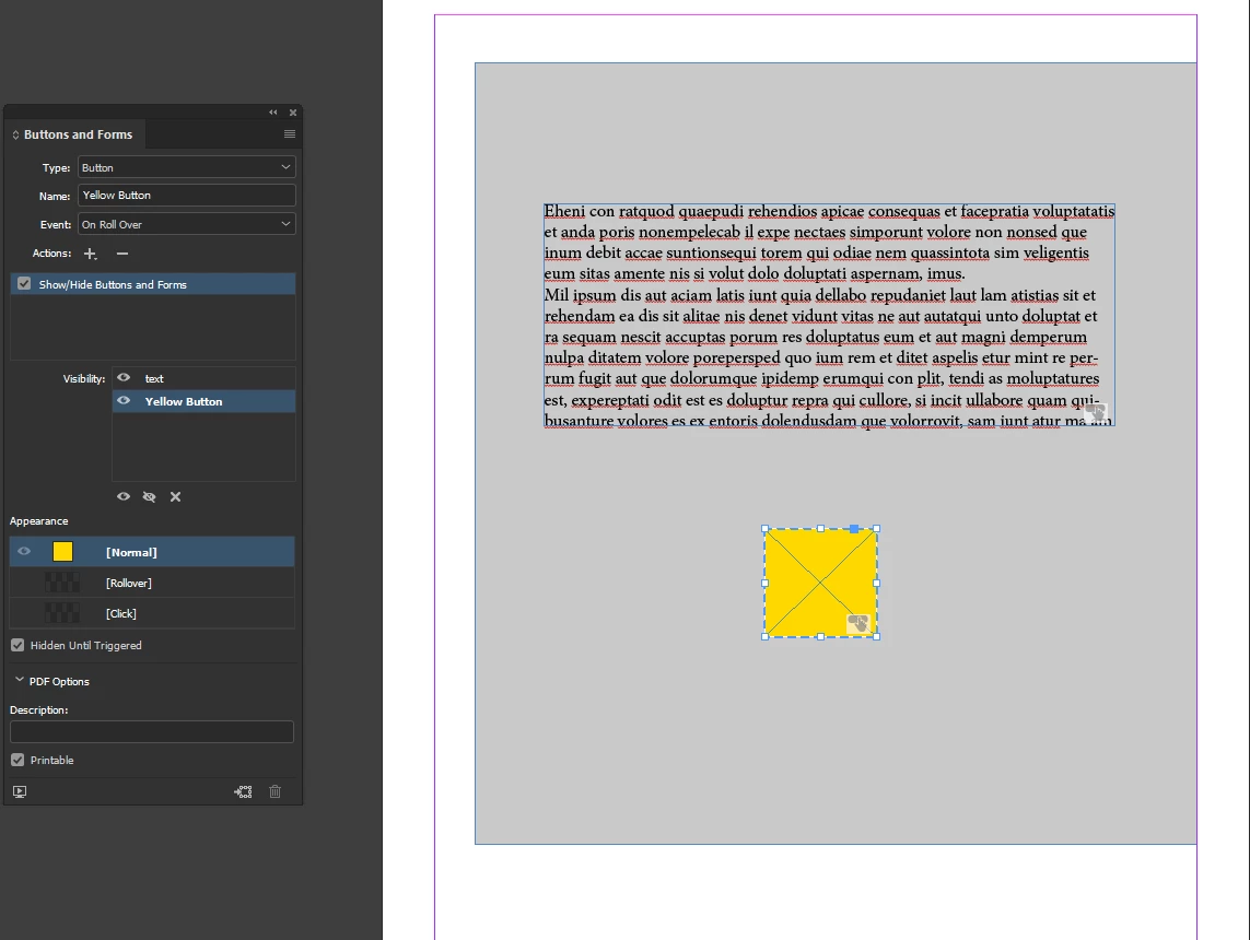 I have a yellow button, and I'd like to make this an interactive element. When I hover-(roll over) over the Yellow button, the text appears, and when I hover off-(Roll over), the text disappears. Im too confused about the button panel, I cant get it to function properly.