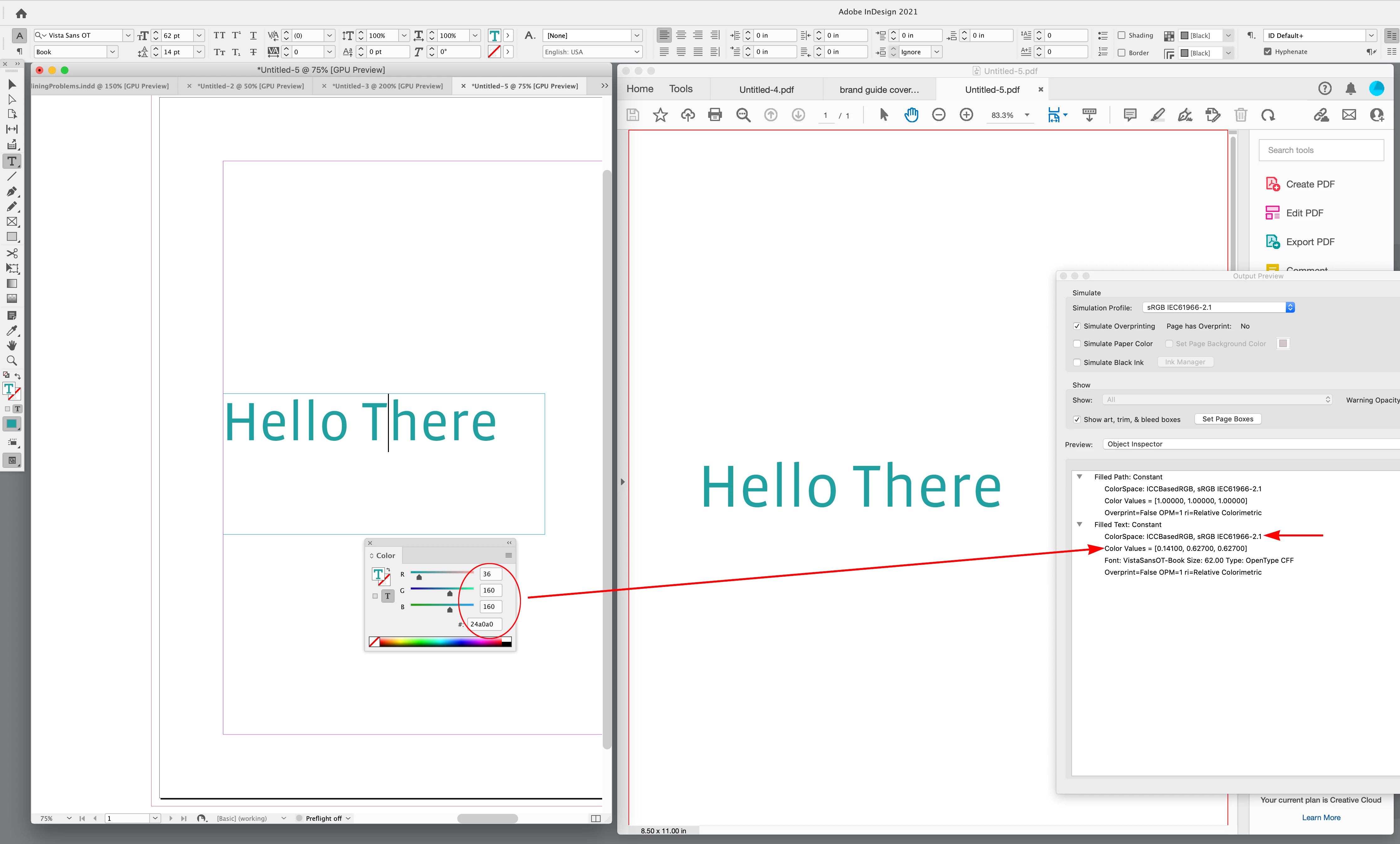Now when it exports and I open up Acrobat, goto Edit Pdf, and select some colored text, the RGB values have been shifted and not exactly the same. Why is this happening? I have tried exporting with various settings, but only when I set it to export for print do the RGB values stay intact. Otherwise it is somehow shifting the values ever so slightly when checked in Acrobat.