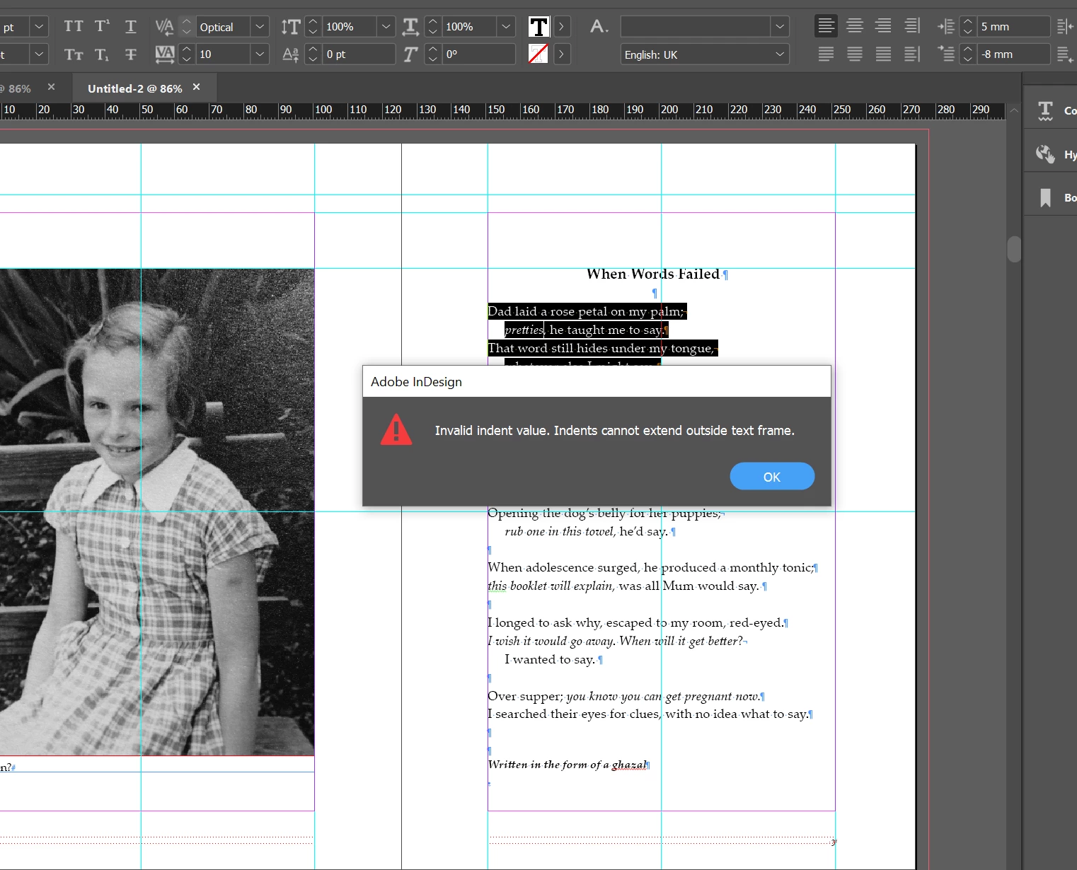 I'm getting the error message 'invalid indent value' but it makes no sense. I made the first line indent a negative and the rest of the para a positive in order to create turnover lines in a poem. Obviously, the minus value of the first line shouldn't exceed the positive value of the paragraph, but InDesign won't allow me to do this. The positive value is 5.009mm (I'm sure it was 8mm last night!) and the negative value is 8mm: this makes no sense! And I can't change either value either way without getting the 'invalid indent value' error. I've tried resaving the file as ID template and renaming but no luck.