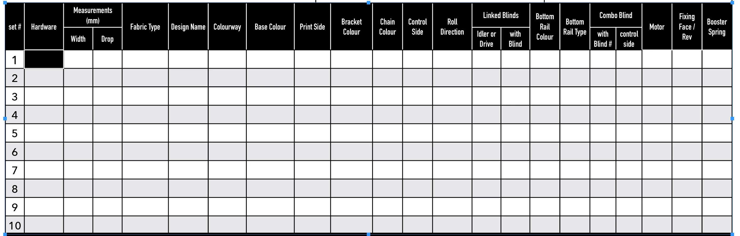 Hi, I'm creating an order form that needs to have multiple options for configuring items. You can see the table I've set up in the attached file.