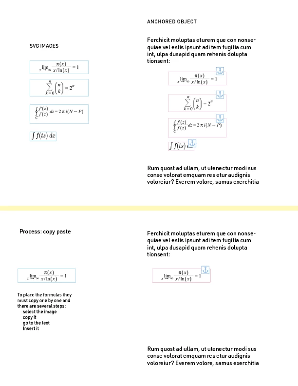 In a text there are several moments where many equations follow each other and putting them one by one seems to be the only way. These images become anchored objects, which in this case is the ideal way to control them.