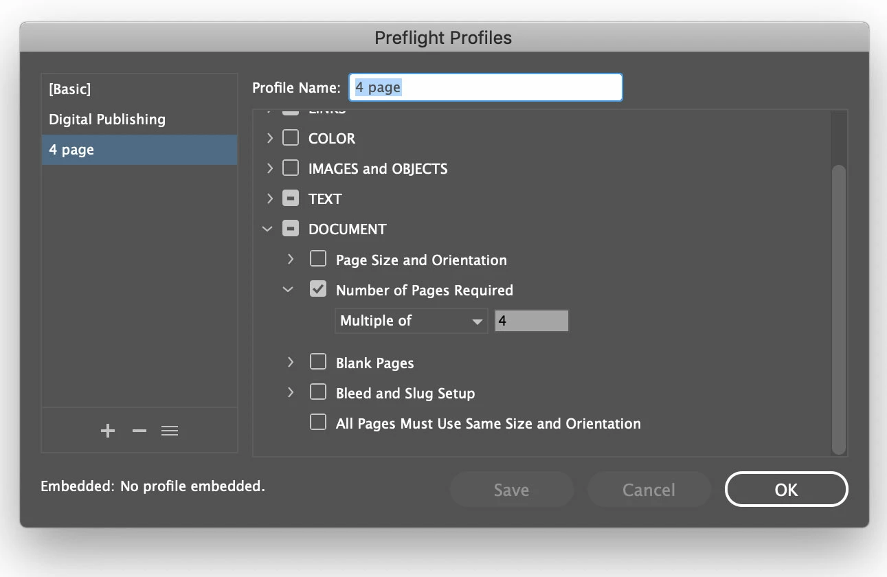 Is there a setting that will cause InDesign to warn you if your page count is not divisible by four?