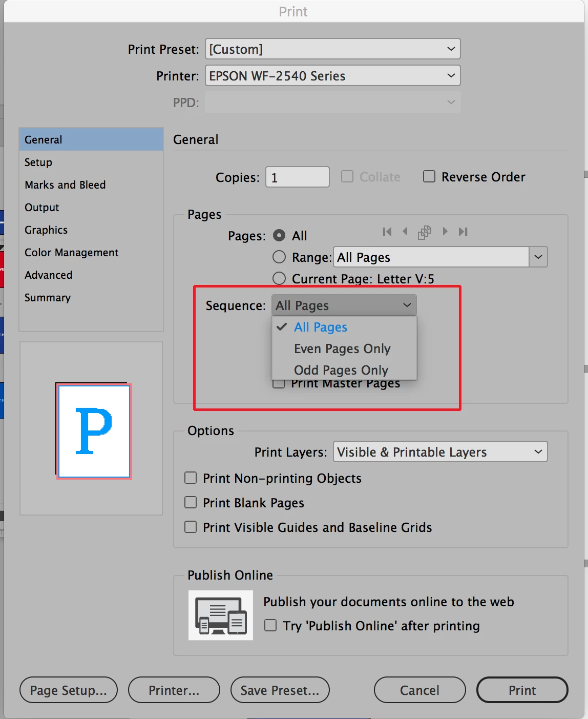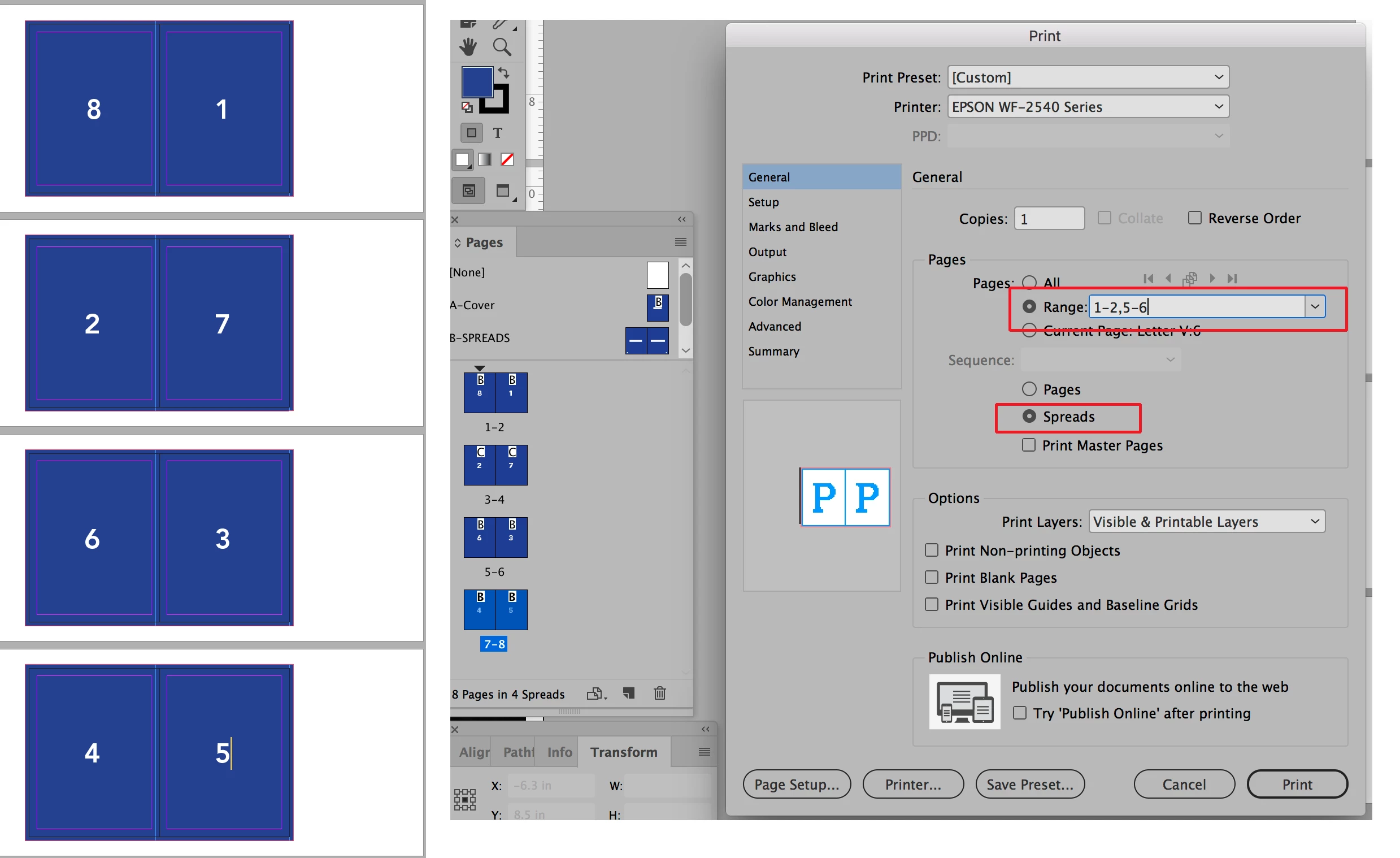 I am totally new to InDesign and I am working on a 52 page booklet in Letter paper. As my pages are small, 5.5" x 4.25" each, I want to save some paper and print on double side as well. So far I was only able to Preview half Letter 1 spread per page in Print. I tried search online for similar questions but no such luck.