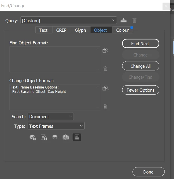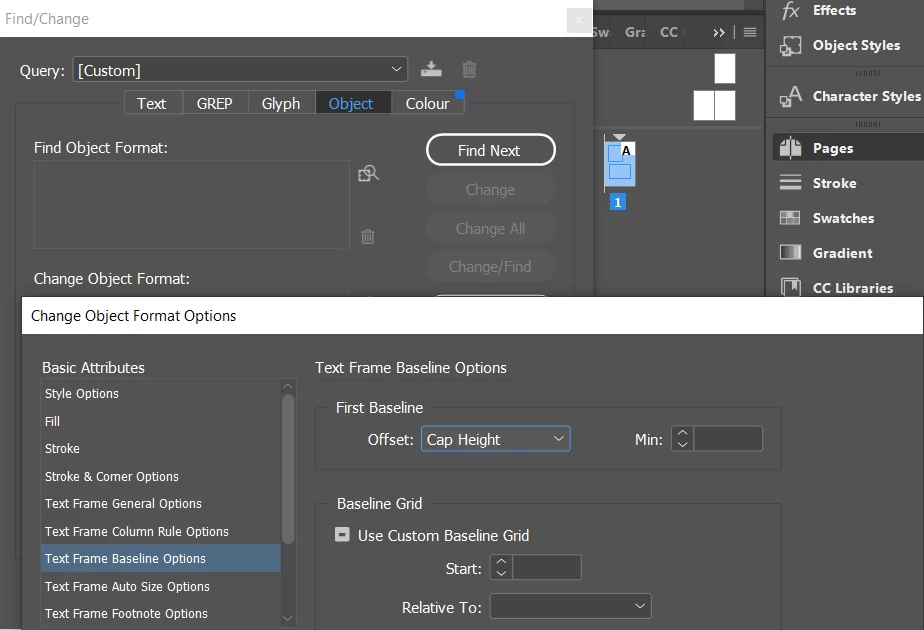 Is there a way to set my text frame options baseline height to all caps for my whole document