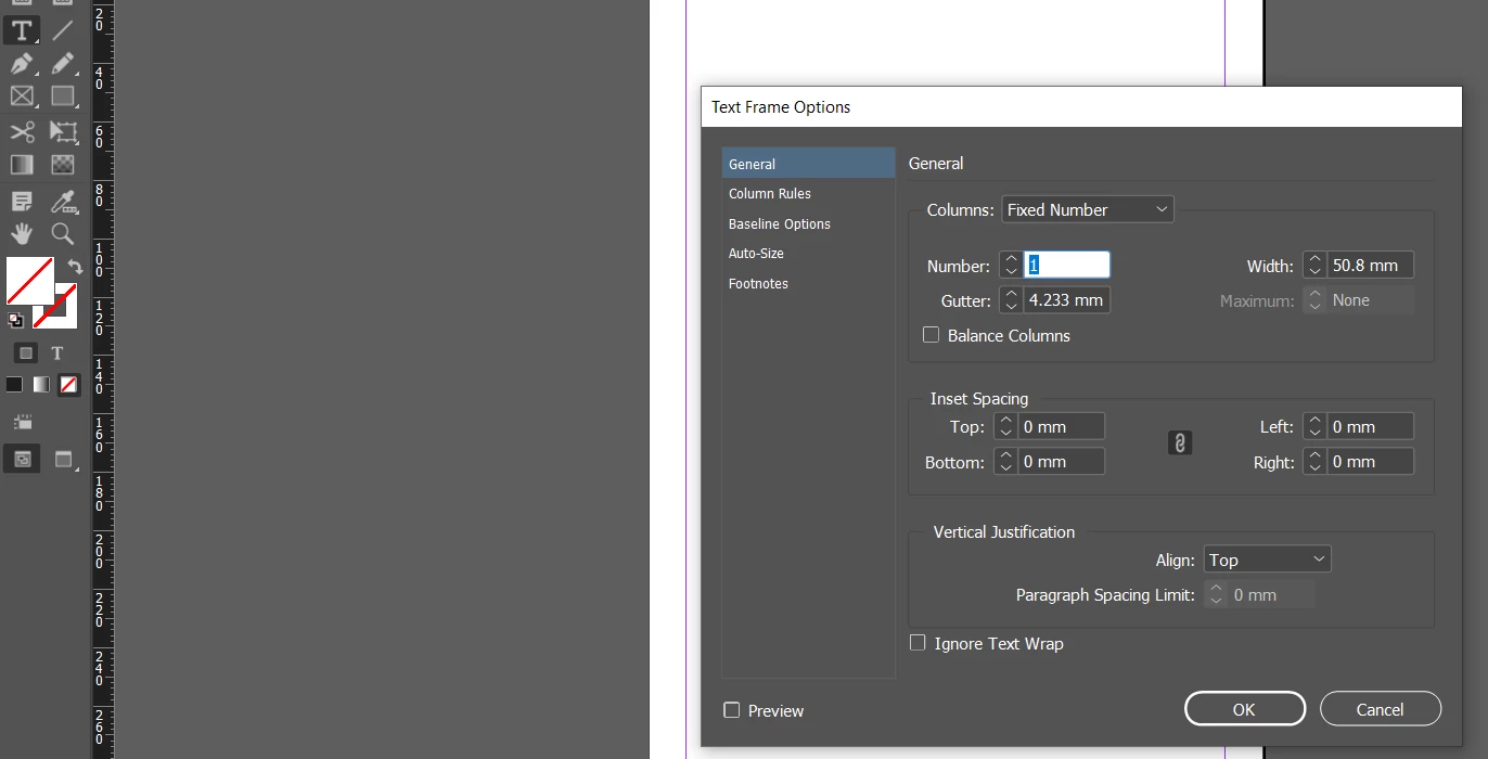 Also - with just the type tool selected go to Object>Text Frame Options
