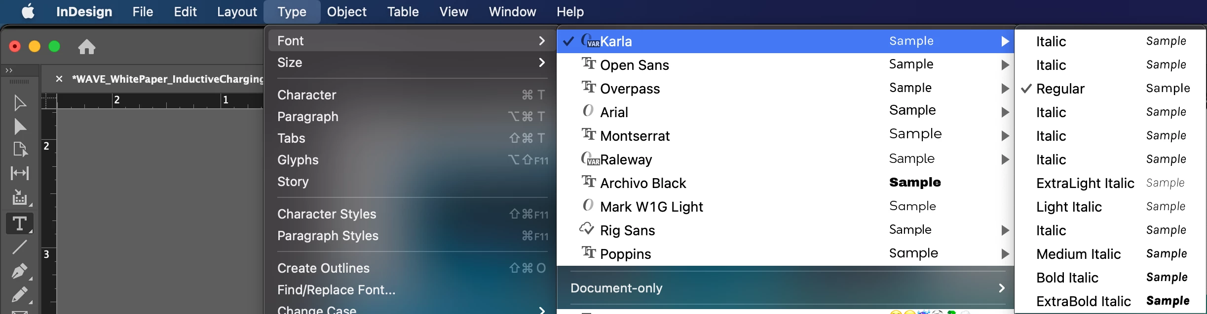 I am using the Google font Karla in my indd document, however all of the font variables are converting to Italic for some reason. For example, I am trying to use Karla Light for my body text, but indd is converting it to Karla Italic. I have tried creating a Paragraph Style with Karla Light, making sure Character Style is on "None", removed and reinstalled the font from my desktop, removed and reinstalled the font from the Document Fonts folder, etc. I do not have this issue with the font on Illustrator or Photoshop, so I believe it might be an InDesign issue.