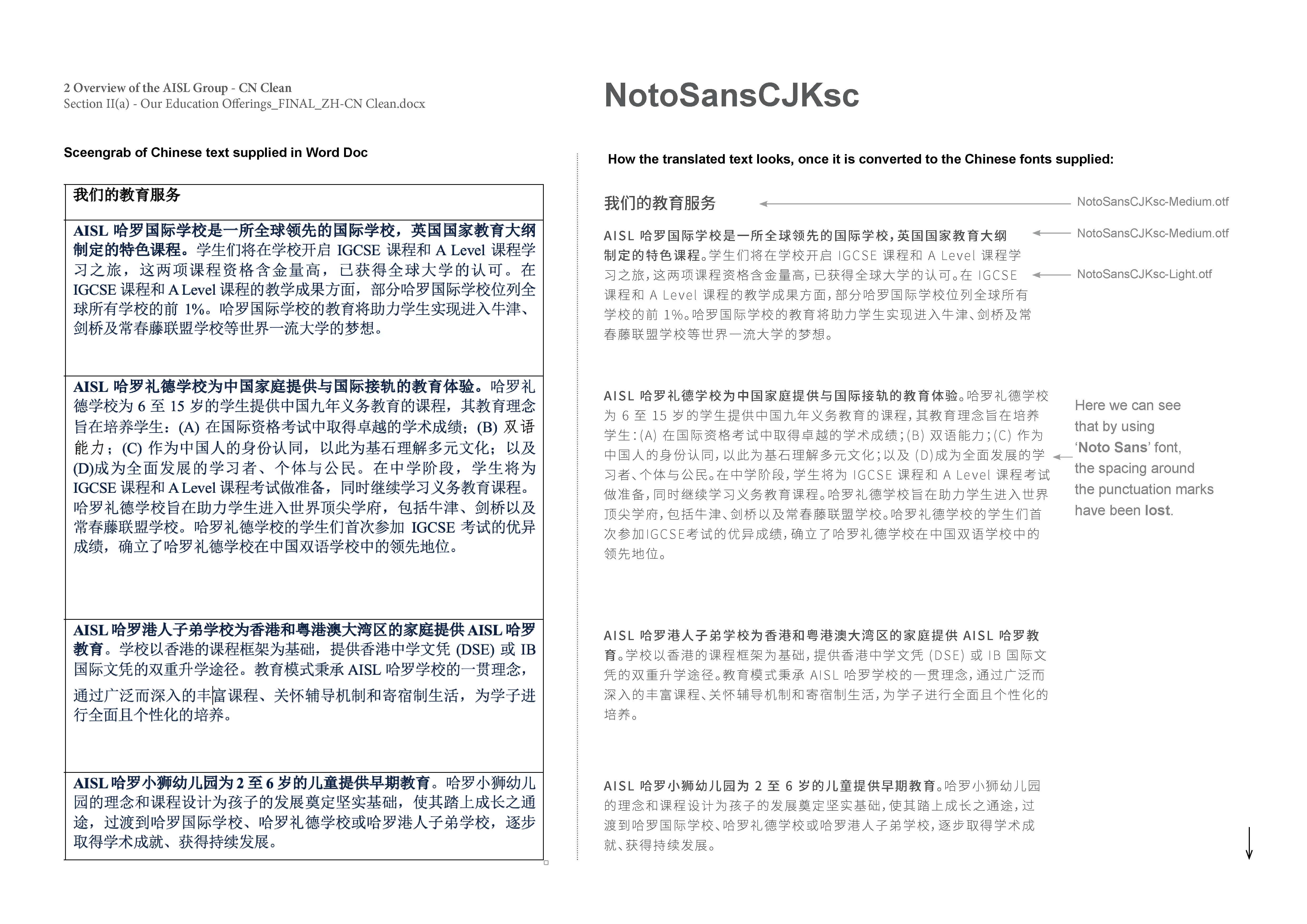 Hello, I am in the UK but working on a document in InDesign for a client in China. They have given us their brand fonts ‘NotoSansCJKsc’ and ‘NotoSertif CJKsc’ and I've installed them into our system. However, when I convert the English text to this Noto font, it removes all the spacing around the 'Kenten' characters, despite the spaces being there on the Word Doc supplied by the client (in China). We urgently need to rectify this, why is InDesign or the font removing the spaces in the text? Please help as we are really stuck...