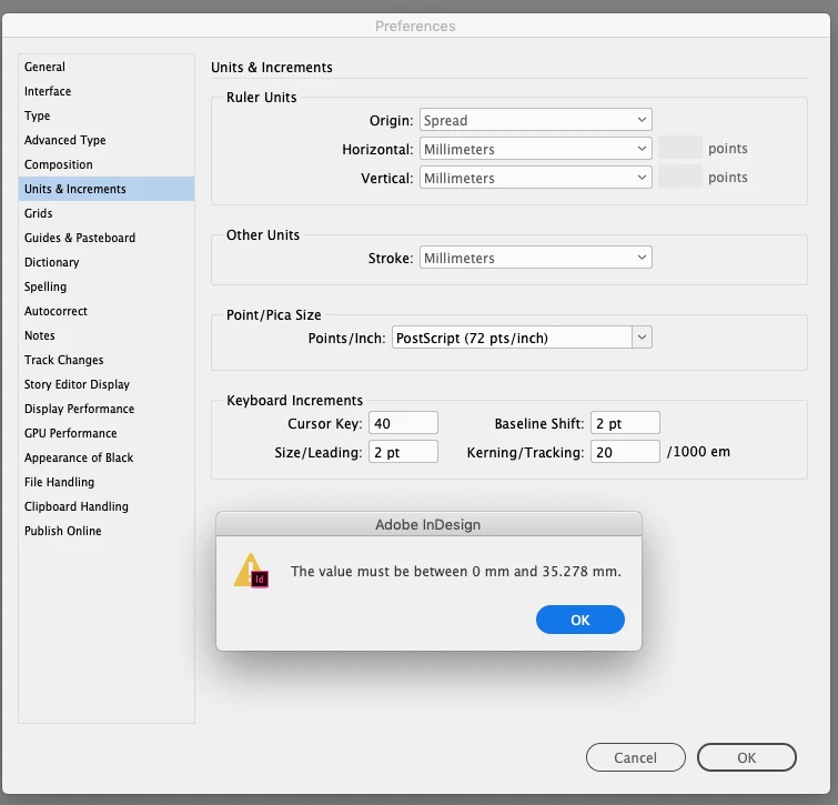 Hi, I had question about Keyboard Increment limitation to max 35.278 mm in InDesign. It is annoing, ok, I undestand purpose of limitatiot, but c'mon... 35mm? please, make this limitation bit bigger - up to ~300-500mm, please. ?