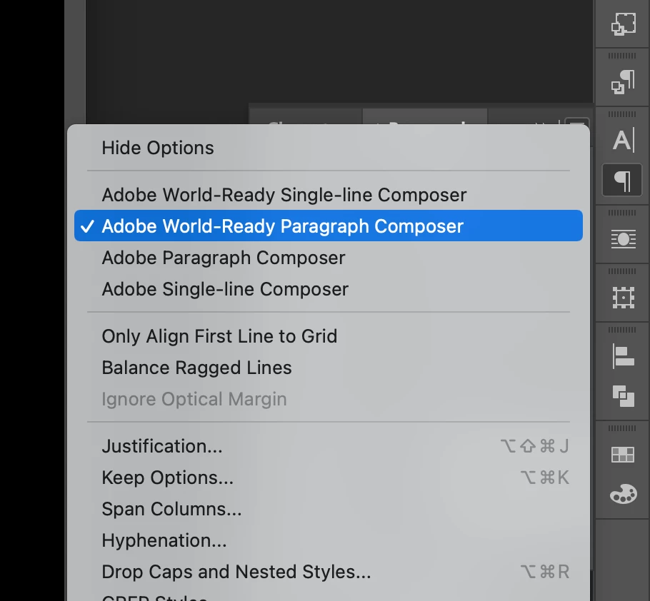 2) In the PARAGRAPH box, I selected ADOBE WORLD-READY PARAGRAPH COMPOSER.