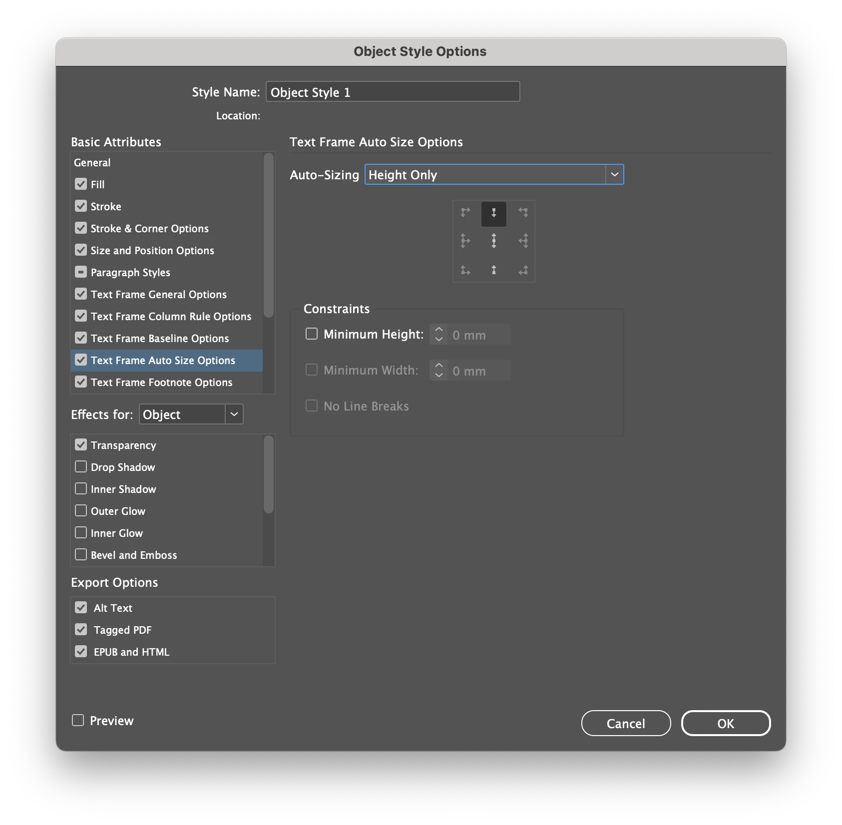 I have a text frame (inDesign) that expands in 4 directions. But I only want it to increase in one direction. Tried all settings in "command B"