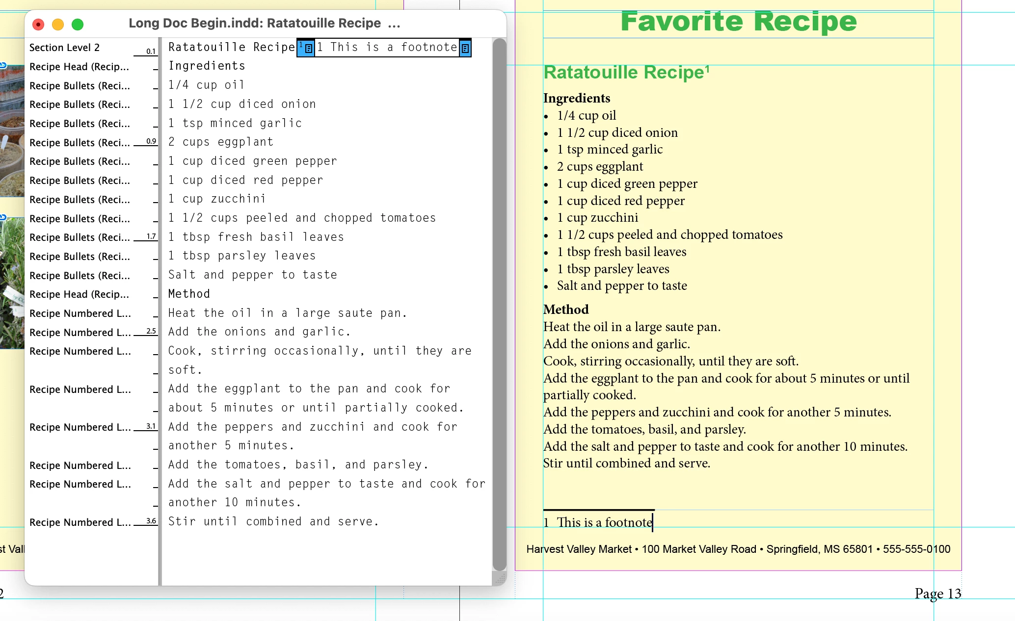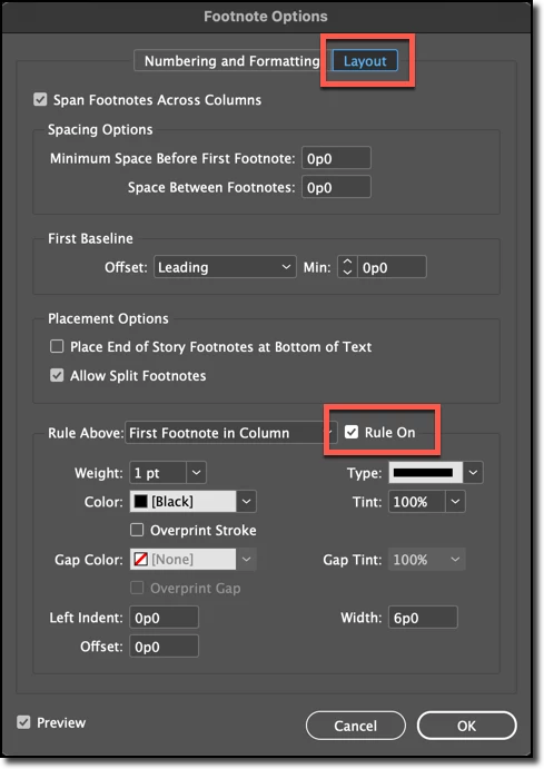 In my example below, you see a footnote set in the text at the top. A separator line appears above the footnote.