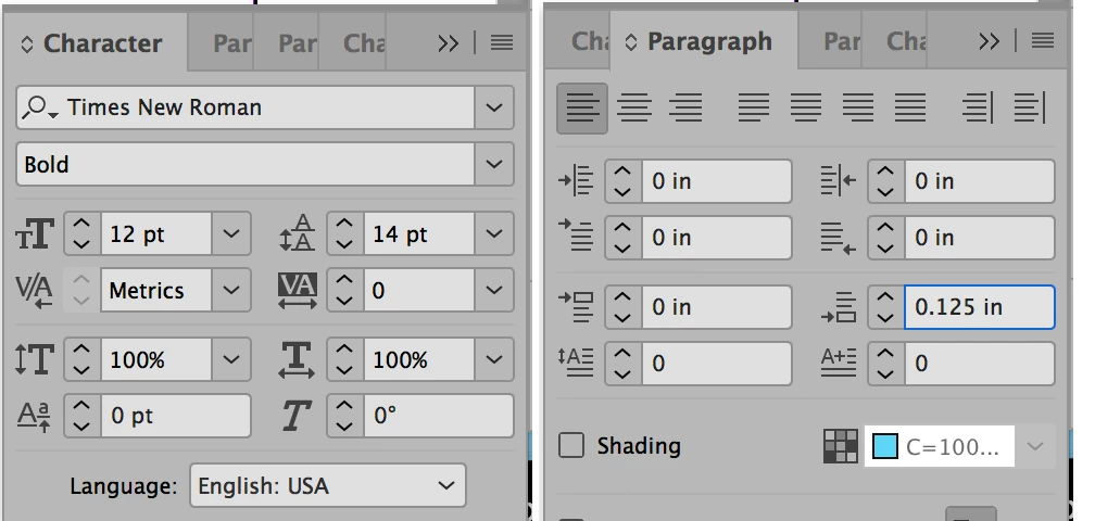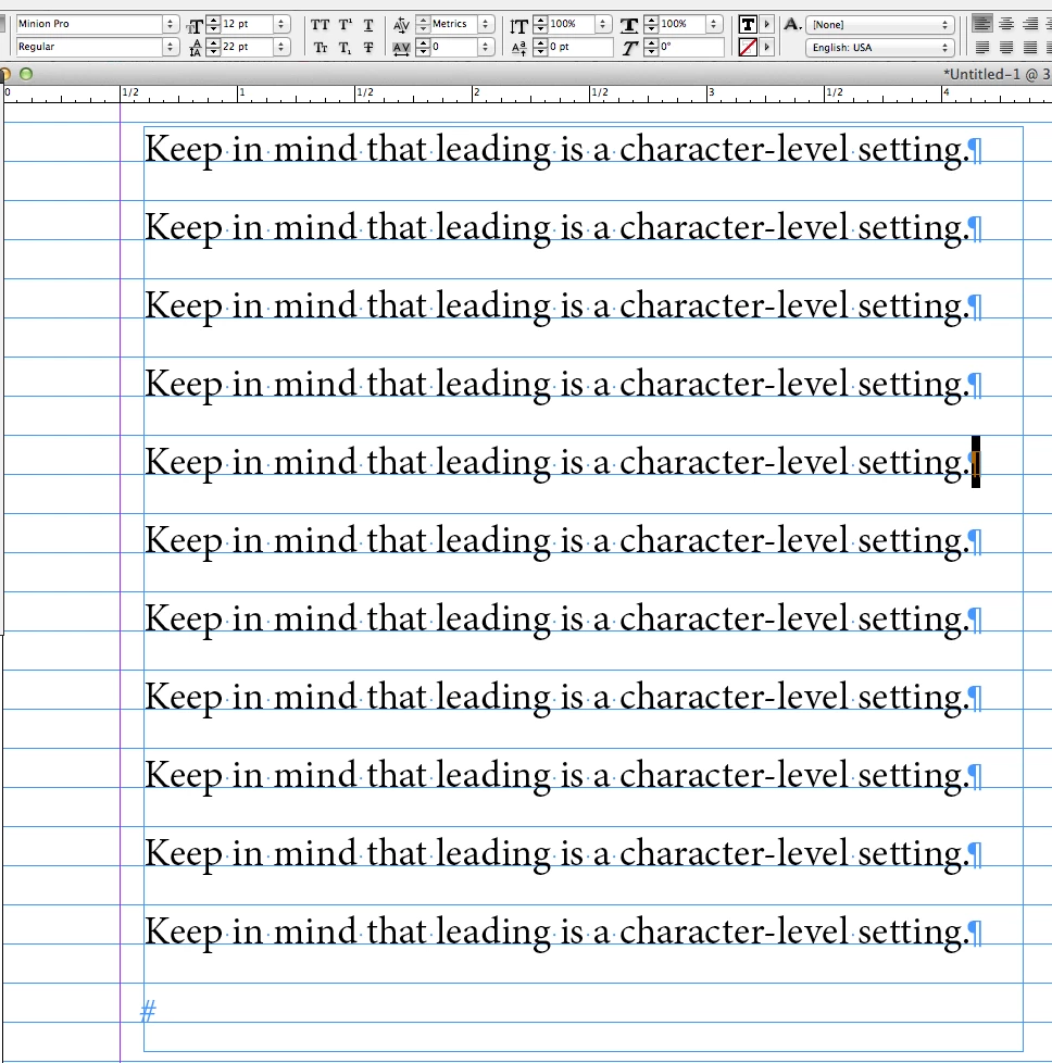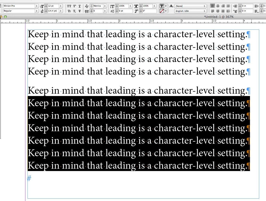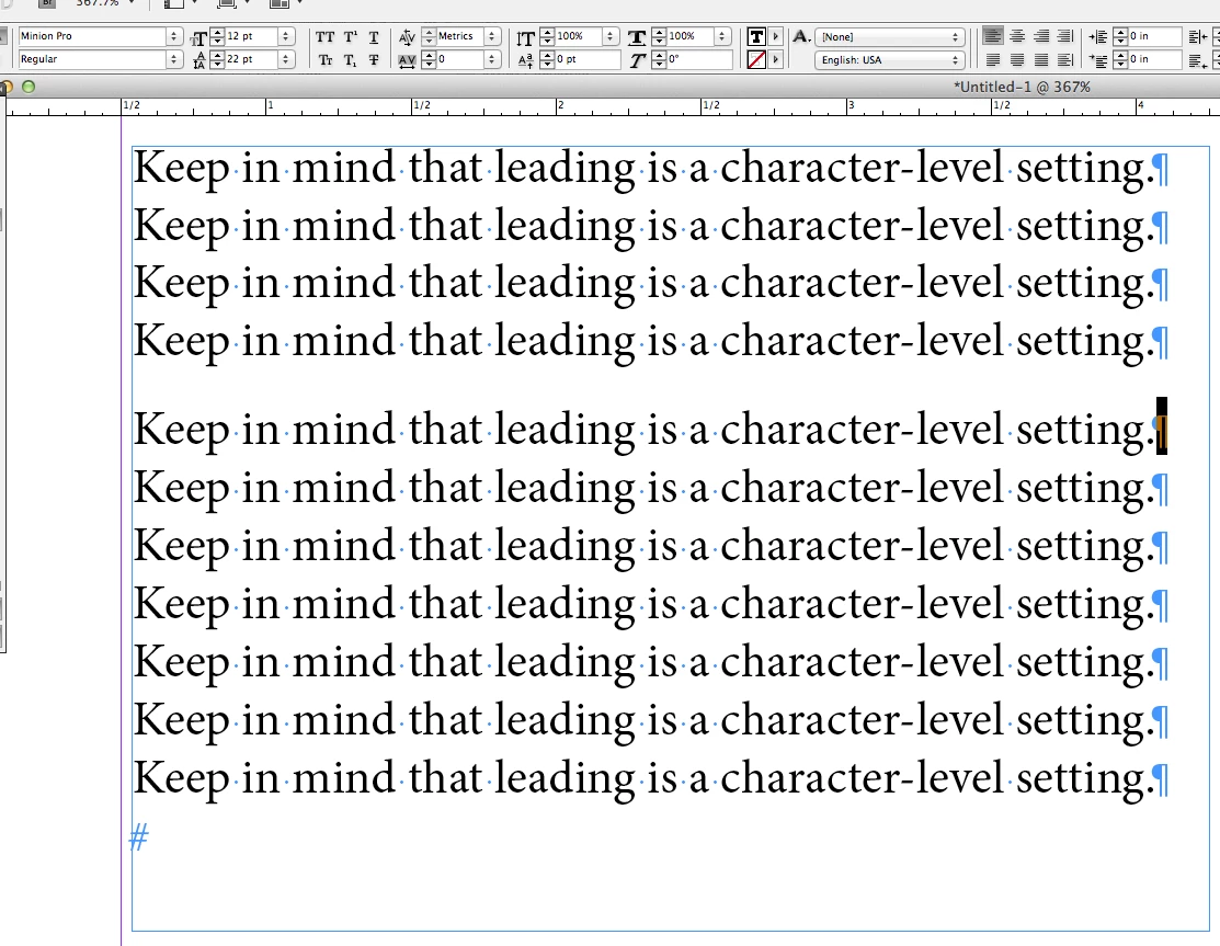 Also, something that isn't readily apparent to everyone is that although leading may seem like a paragraph attribute, it is a character-level setting in InDesign. Notice the gap between lines in this screen shot: