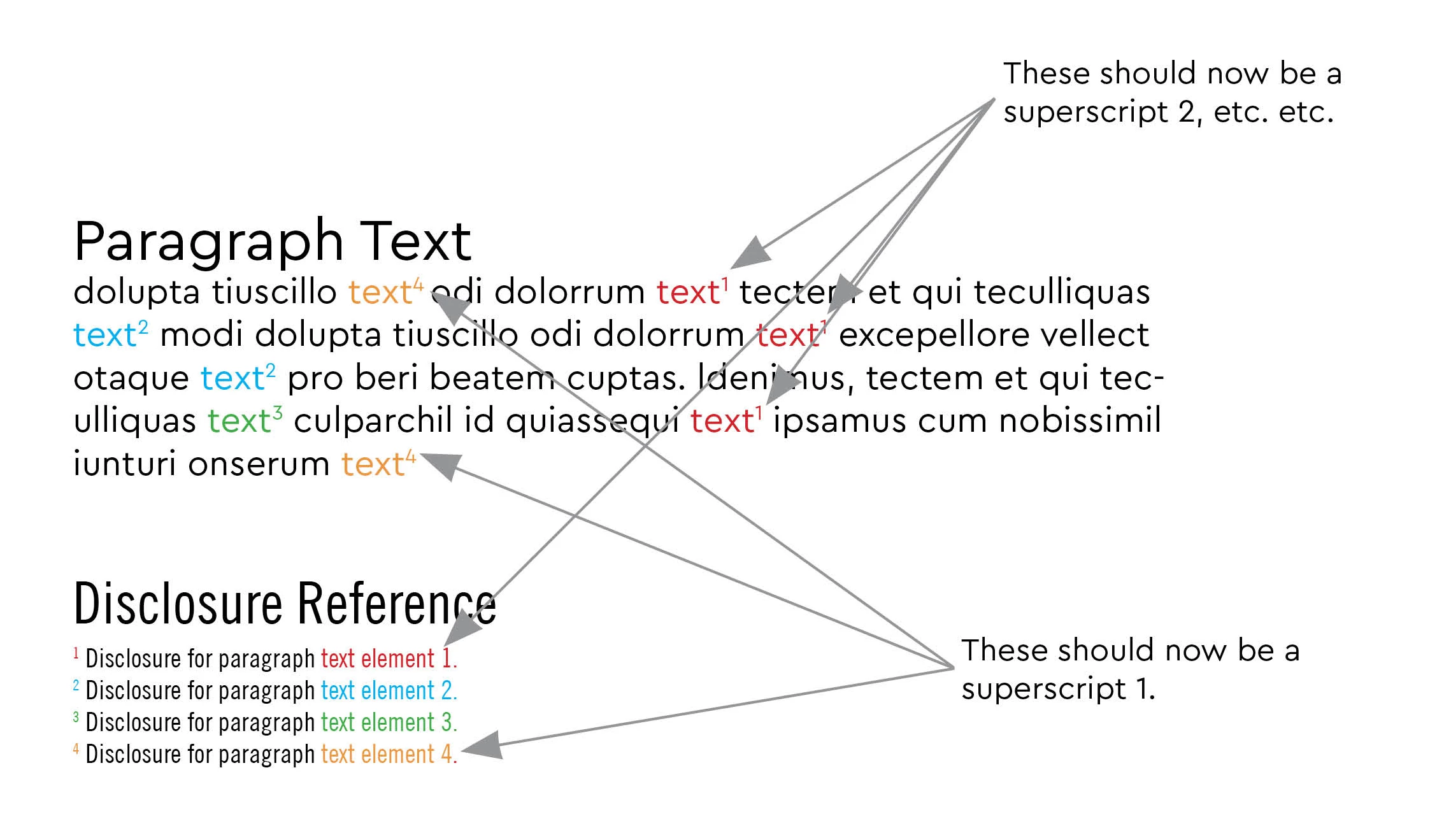 In the simplified example below, all instances of superscript 1 need to change to superscript 3. So I want to change only one instance of superscript 1 to now be superscript 3 and have all other instances of superscript 1 update accordingly. Then I want to change the former superscript 3 to superscript 1, etc, etc. Note that I am only changing the superscript itself, not the text attached to (or next to) the superscript.