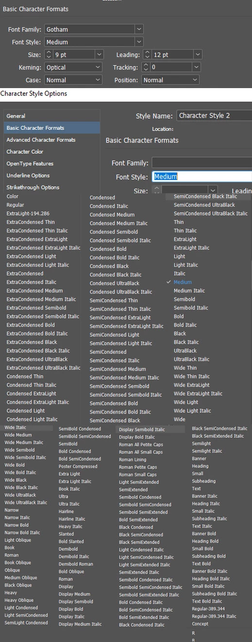 Working with paragraphy and character styles. Lets say my paragraph style font is Gotham and I am adding a character style but want only one or two words to be italic Indesign is providing a list of options not associated to the font.