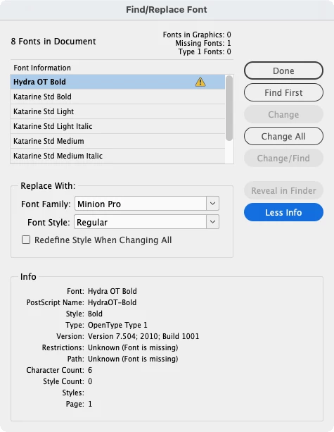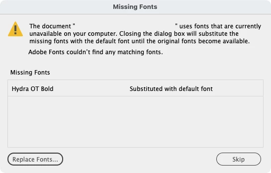 I am working on a MacBook Pro in MacOS Monterey version 12.3. When I open an existing document in InDesign 17.3, the font FF Hydra OT Bold (licensed from FontShop, locally stored on my hard drive, and installed with FontBook 10.0) is reported missing. This is the first time something like this happens. I tried creating a new document in Illustrator 26.3.1 and was able select and use all 20 FF Hydra OT fonts. When I tried the same thing in InDesign 17.3, none of the FF Hydra OT fonts are visible in the font menu of the new document. I tried removing the FF Hydra OT fonts from FontBook and reinstalling them to no avail. Restarting also doesn’t help.