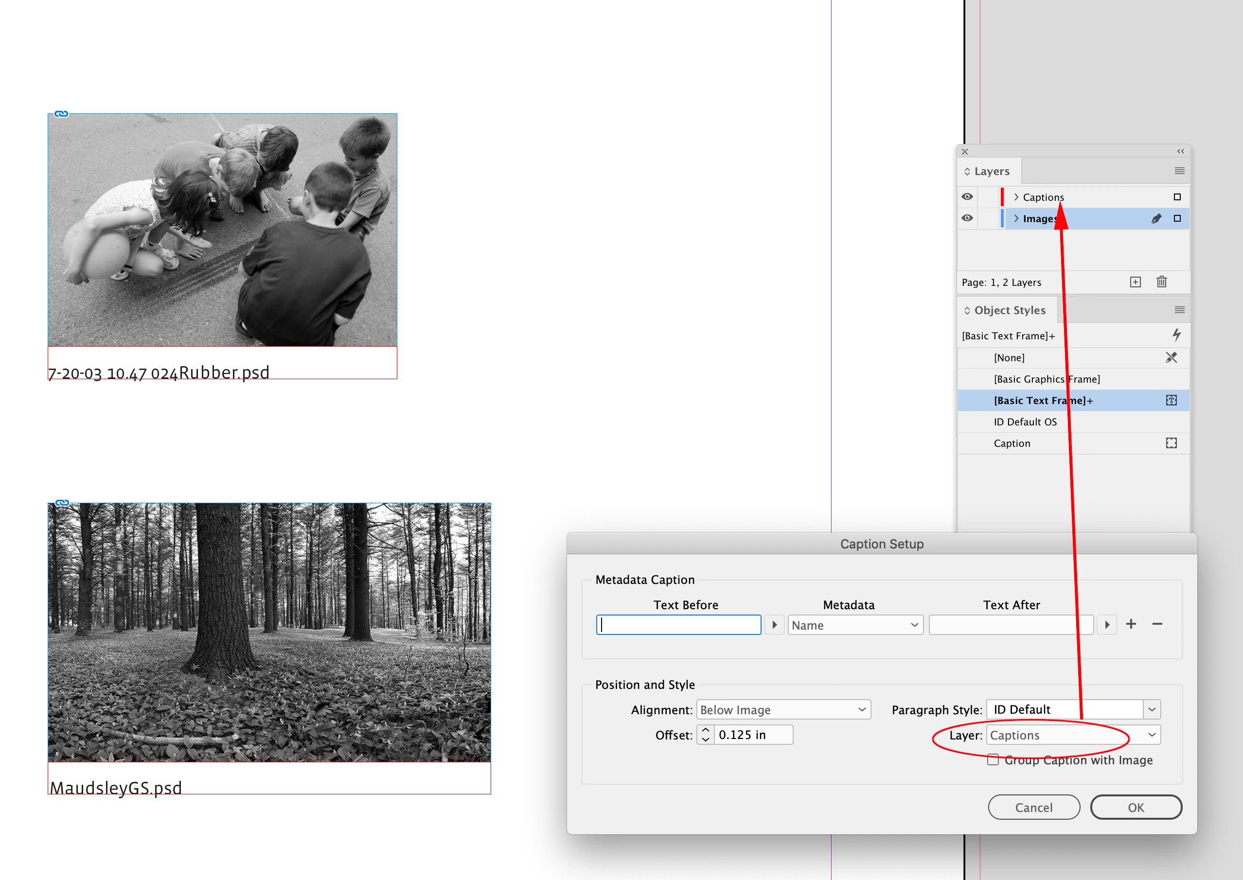 Not sure I follow this. Yes, IF the caption frames are (manually) moved to another layer, you can apply a global fix, but that separates elements of the feature, which is already cranky about how it's managed. Wouldn't it be equal effort and perhaps more stable to just apply the Object Style to each caption frame? Since a manual step has to be involved?