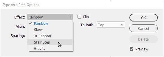 highlight the letter again and go to the Type>Type on a Path>Options... menu command. In the panel select the Stair Step option in the Effect: options box, then select OK.