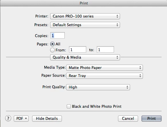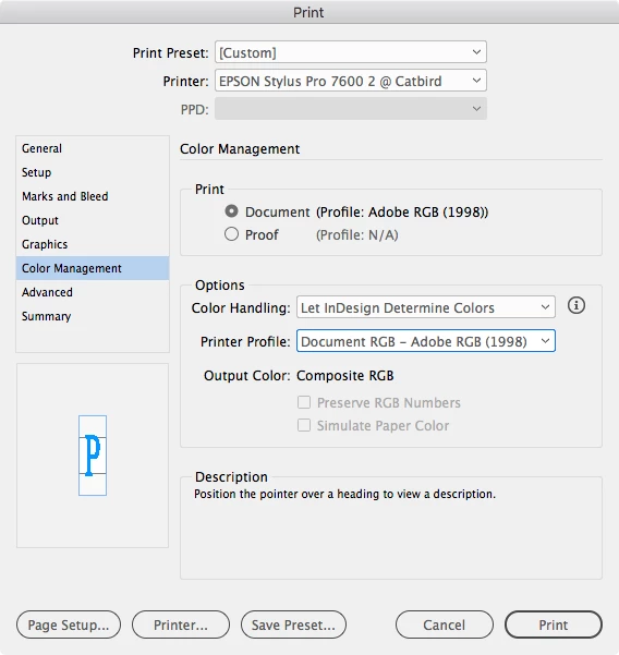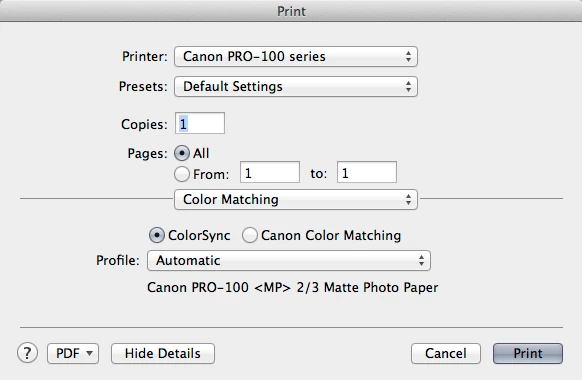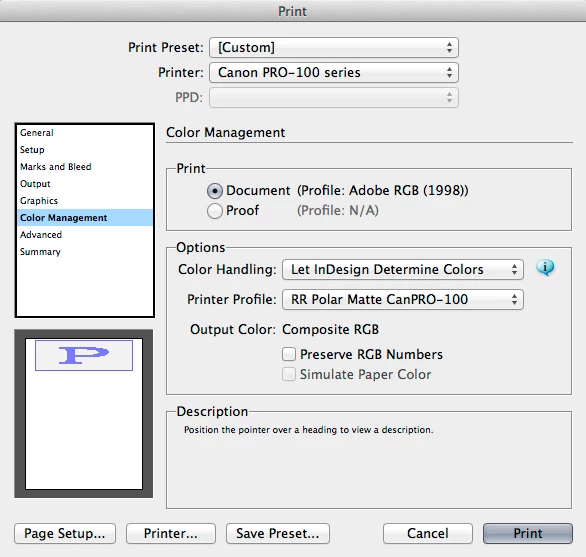 I'm printing from IDCS6 on Mac OSX 10.8.5 to a Canon Pixma Pro-100 inkjet printer using the Canon driver (v16.20.0.0). My Epson printer died, so I bought this Canon and am frustrated with color management controls.